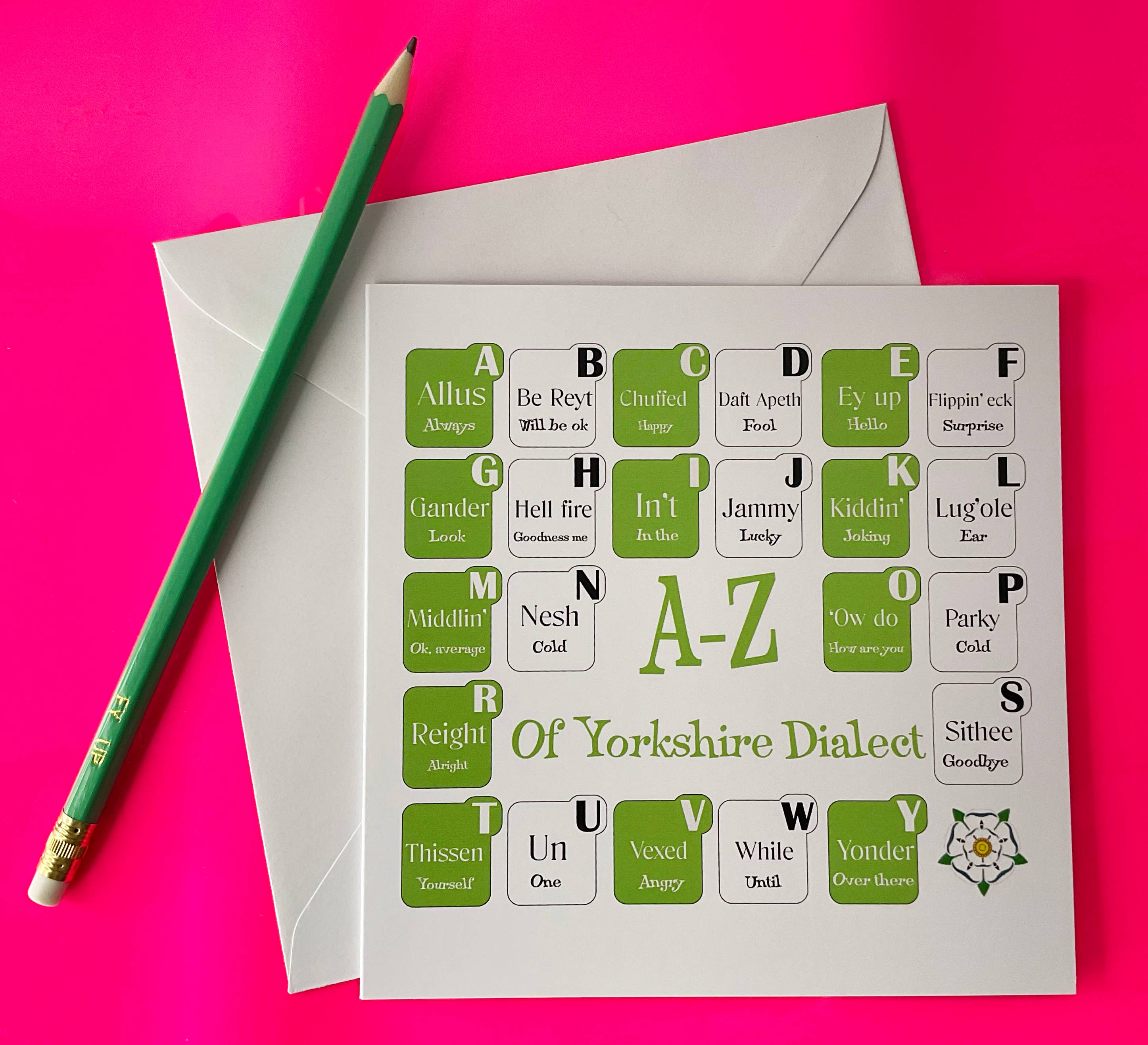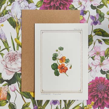 This high-quality greeting card measures 5 x 7 inches. It is blank inside. The card ships in a clear cello bag along with an envelope. This design is also available as a print and magnet. Made in the USA.