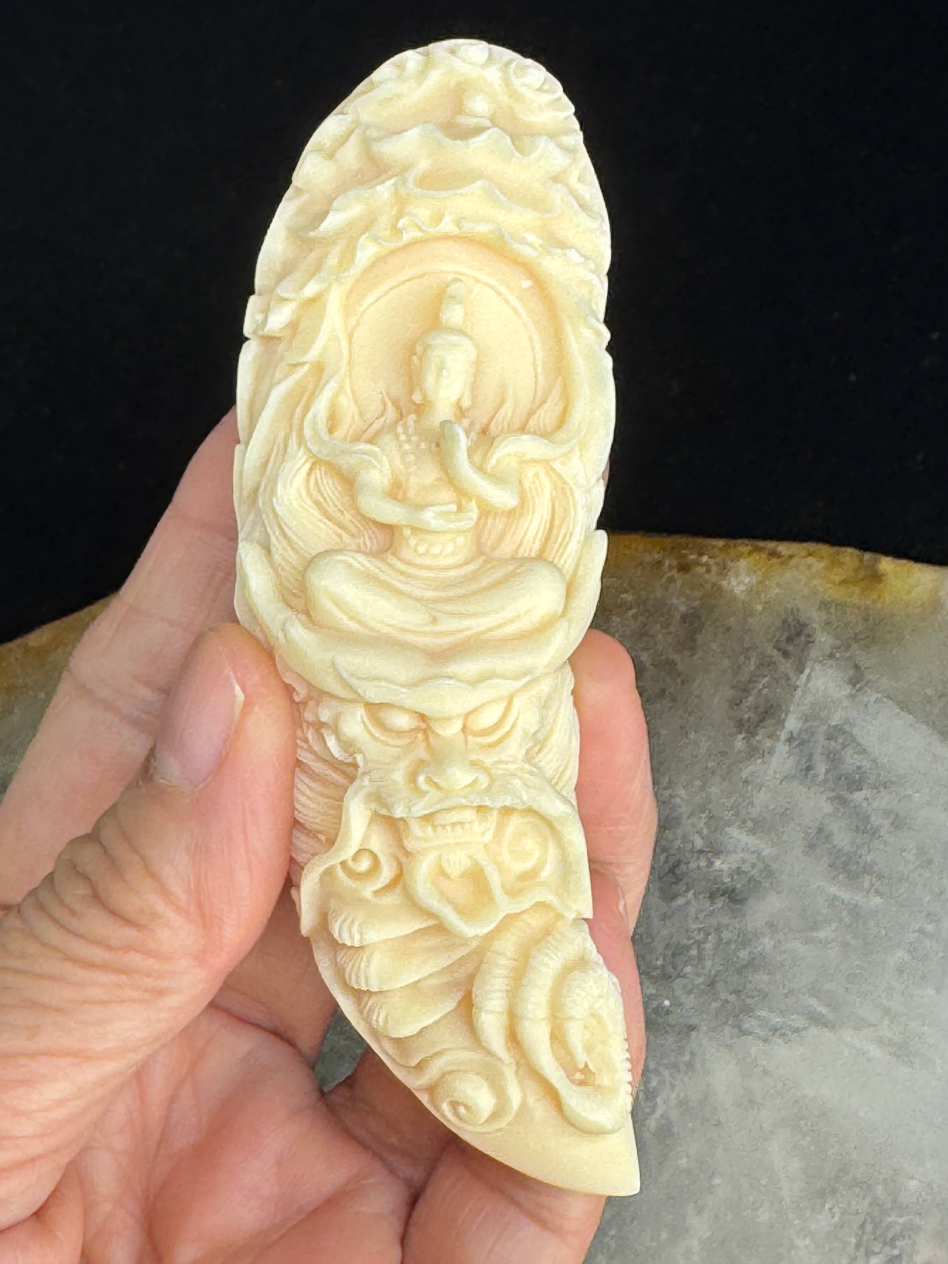 Palm nut carved Guan Yin Buddha charm guru bead Approx 2.3" Buddha, meaning "The Enlightened One," refers to Siddhartha Gautama, a spiritual teacher from ancient India whose teachings form the foundation of Buddhism. After attaining enlightenment through deep meditation, he shared insights on overcoming suffering and achieving inner peace through mindfulness, compassion, and ethical living. The Buddha's wisdom continues to inspire millions worldwide, emphasizing the path to spiritual awakening and liberation from worldly attachments. Palm nut carving is a unique and eco-friendly art form that transforms the hard, ivory-like shells of palm nuts, such as Tagua nuts, into exquisite, handcrafted pieces. Ideal for those who appreciate sustainable and ethical craftsmanship, these carvings are perfect as jewelry, miniature sculptures, or decorative accents. With its resemblance to traditional ivory, palm nut carving offers a guilt-free alternative that supports environmental conservation.