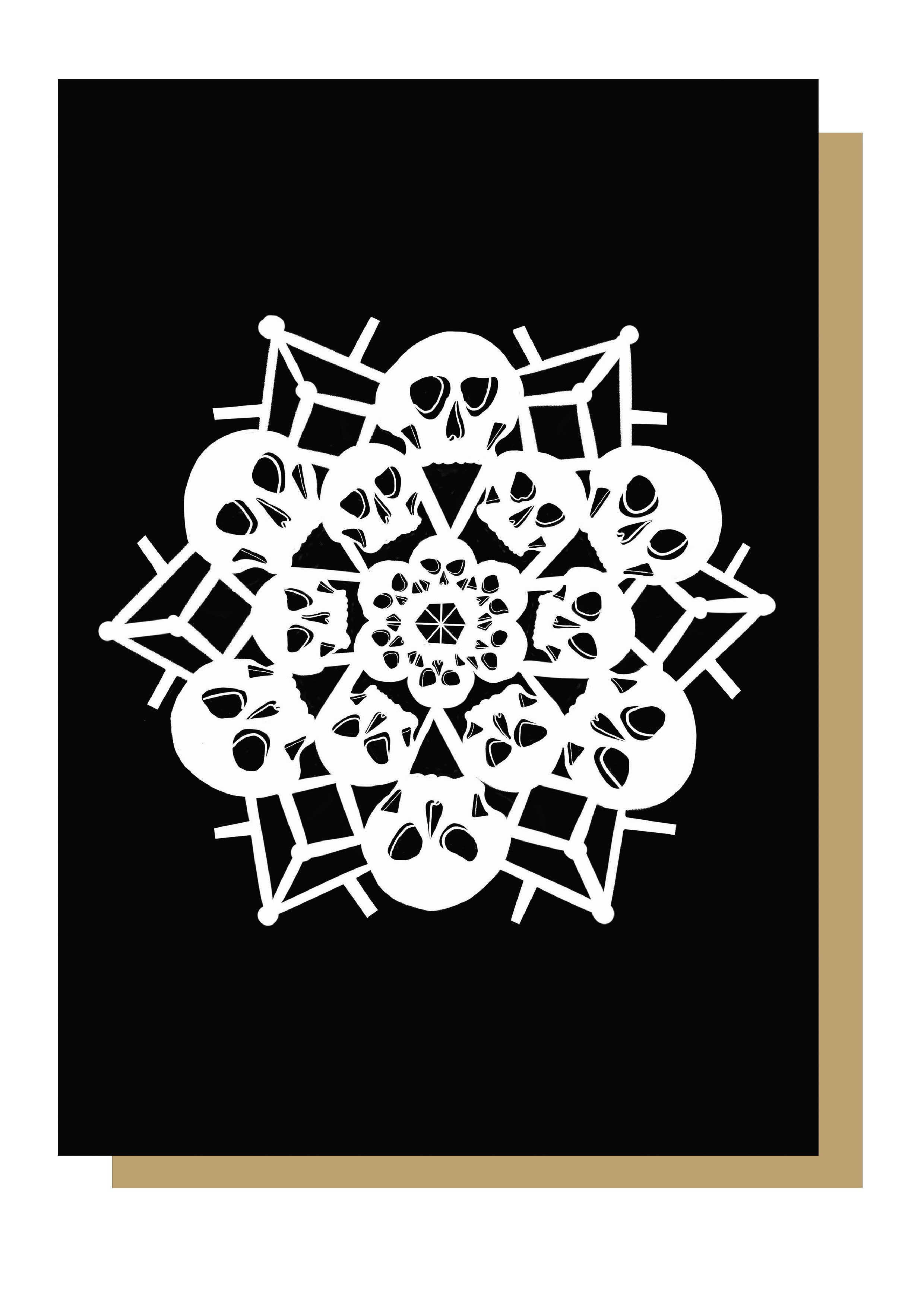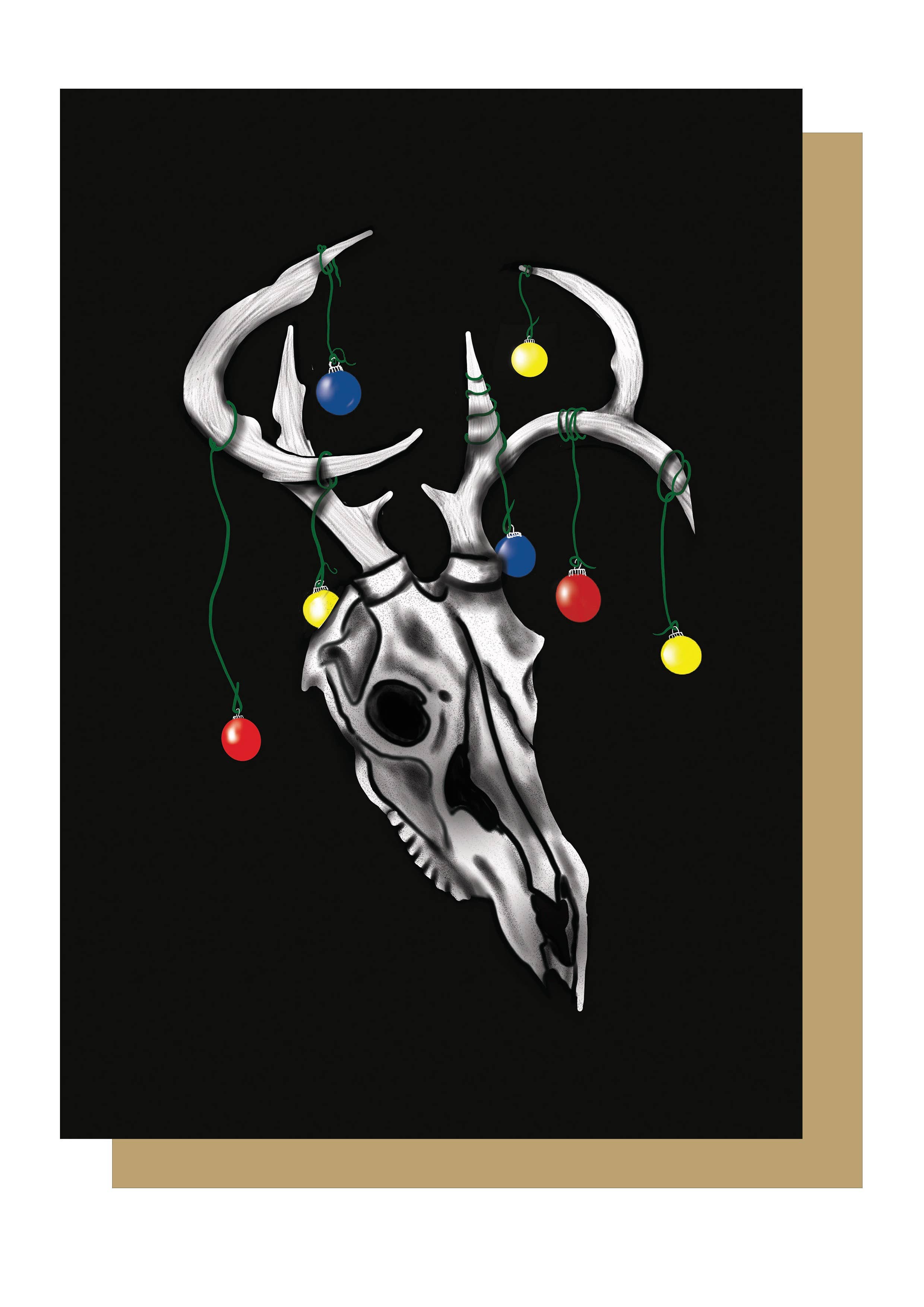 Gothic Christmas Card This skull is dressed up with lights and ready for the festive season. This card was originally a painted in acrylic so has some nice paint brush details. All greetings cards are original illustrations by Emma Printed in the UK Printed on high quality 300GSM and FSC approved paper Size: A6 (105 x 148mm) Each card is blank for your own message Kraft (brown) recycled envelope is included All cards are packed in biodegradable cellophane and a do not bend cardboard envelope so they are protected, but plastic free.