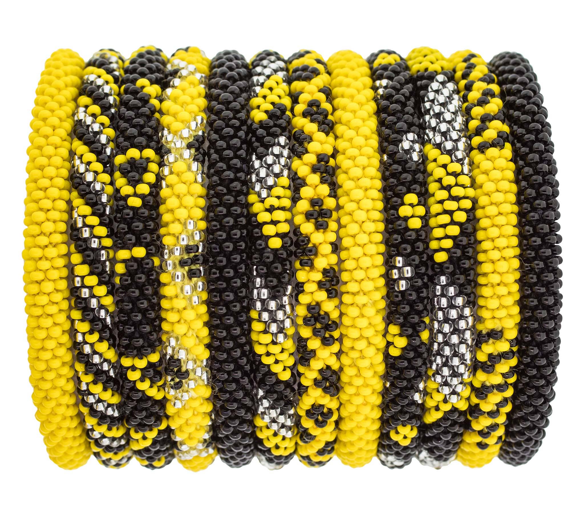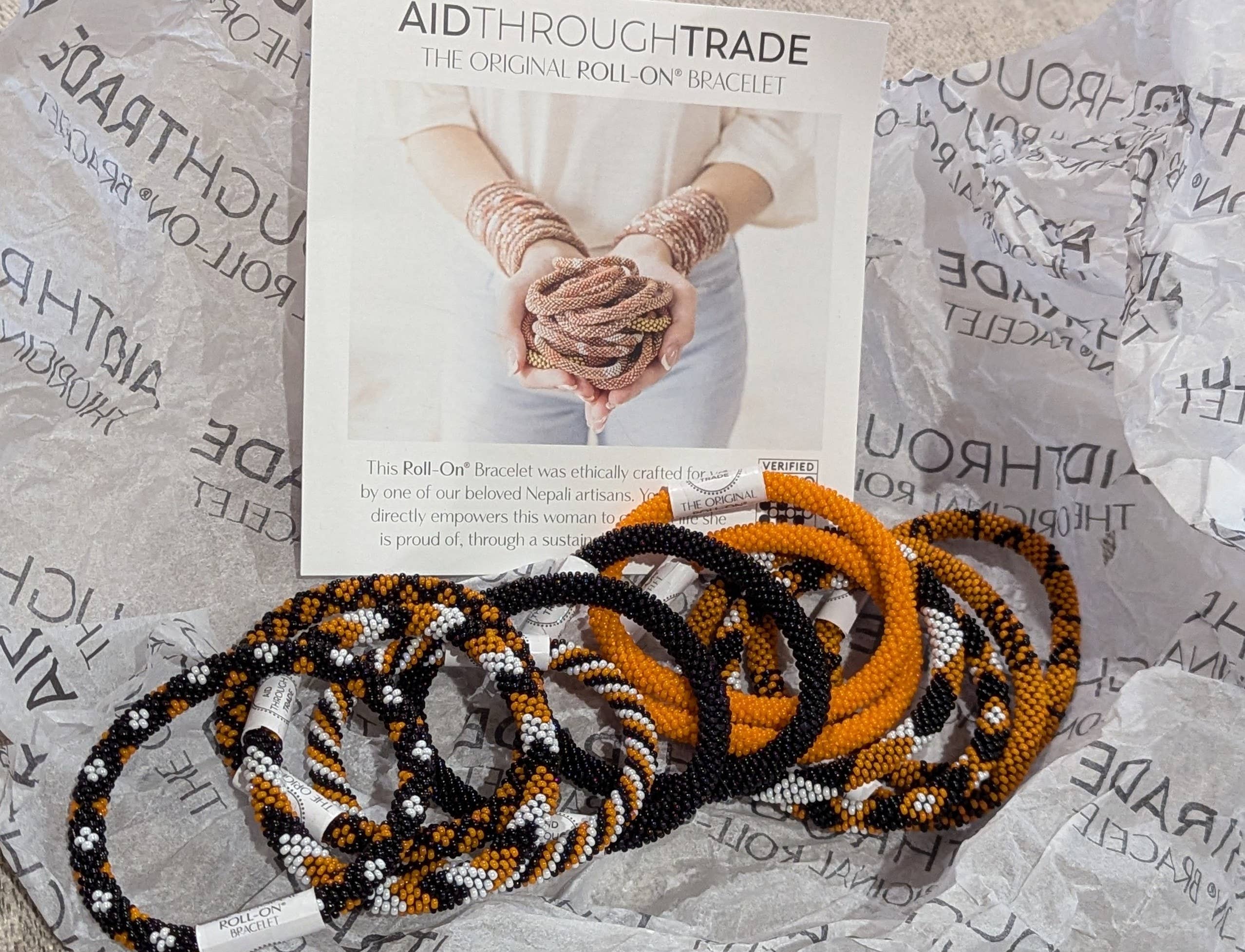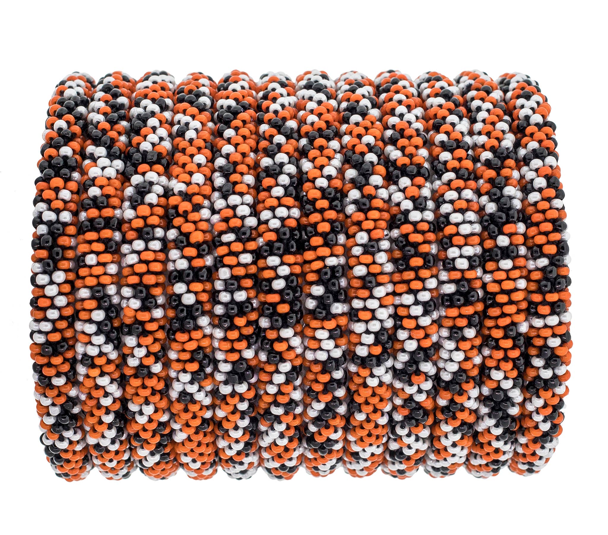 - Celebrate Halloween or Cheer on your favorite team! - The Original Roll-On® Bracelet - Set of 12 bracelets; $6.50 per bracelet ($78 for the Set of 12) - Approximately 7” round - Ethically Crafted by our women artisans in Nepal - High quality glass beads and hand-dyed cotton thread - Expands over your hand to fit most wrists - Aid Through Trade is a Founding Member of the Fair Trade Federation and is the only authorized provider of Fair Trade Roll-On® Bracelets -Perfect for back to school + football season! -Perfect for pumpkin picking!