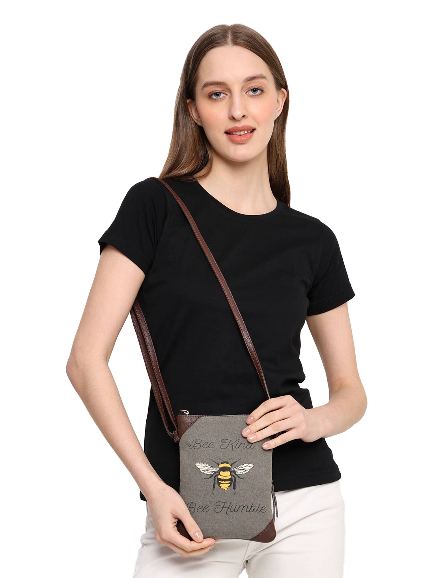 Size: 6.5" W x 8.5" H Handle: 15'' adjustable strap Exterior Features: Back zipper pocket |3.5"H X 6" W| with RFID blocking technology and Top zipper closure. Material: Recycled, Up-cycled gray Canvas with original Leather