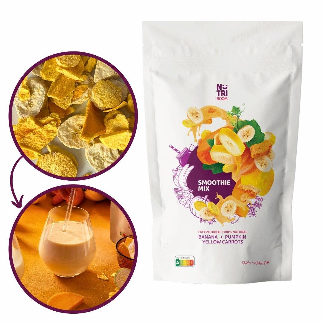 Smoothie blend Yummy from freeze dried: strawberries, bananas 20g No added sugar. Crafted for both the health-conscious and the time-savvy, this blend offers a quick, nutritious solution to the modern-day diet. Ready to Blend or Snack: Whether blended into a smooth, rich smoothie (by adding juice or milk, or plant based drink) or enjoyed as a crunchy snack, this versatile mix caters to various tastes and preferences, making it a perfect addition to your offering. Sustainability at Heart: Stored at room temperature with a long shelf life, our Dark Pink Smoothie Blend reduces waste and energy consumption, embodying our commitment to sustainability without compromising on quality or convenience. Pure & Wholesome: Clean labels promise with no added sugars or preservatives, this gluten-free and vegan-friendly blend aligns with a clean eating philosophy, offering a burst of natural flavours and nutrients in every serving. Choose NutriBoom where taste meets sustainability.