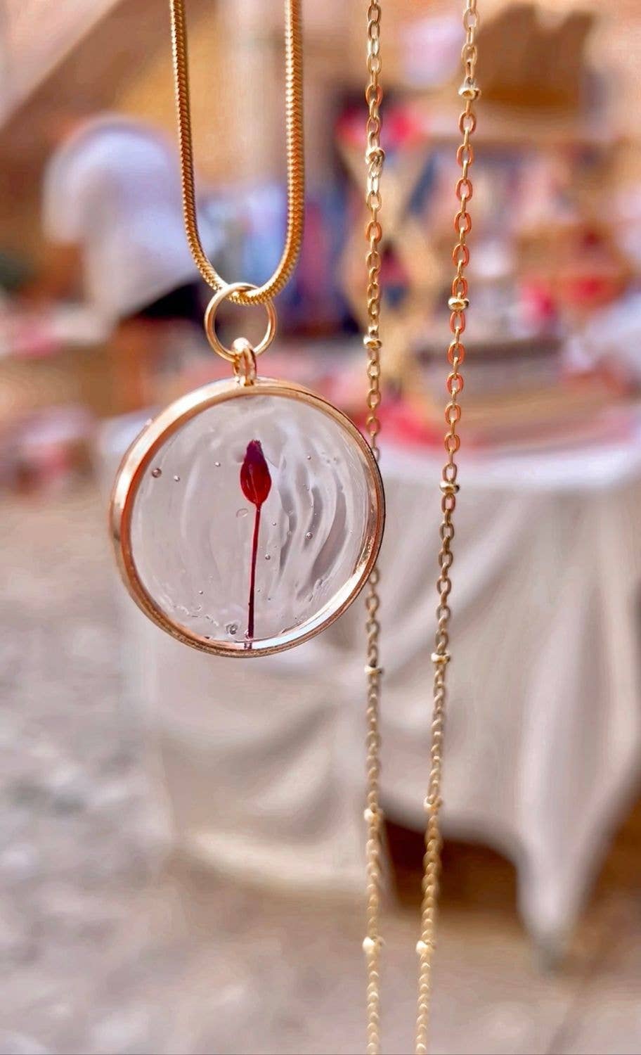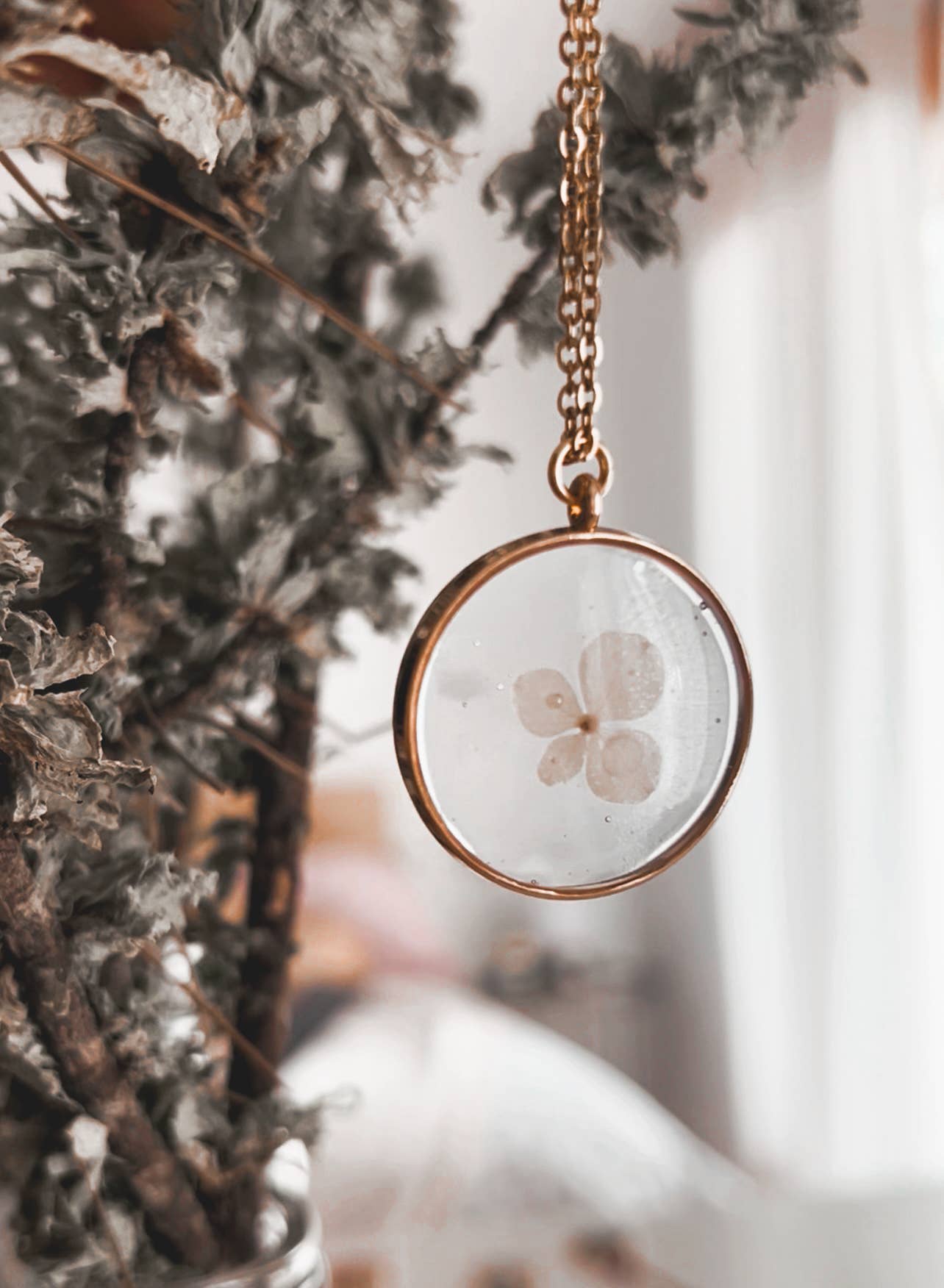 Pendant made with non-toxic bio-based resin (EcoEpoxi), wildflowers, and plants from various parts of the Mediterranean. Includes a natural mineral. All Camile jewelry pieces are unique, handmade with selected natural flowers and plants, dried and encapsulated in resin in an artisanal way. Therefore, no two pieces are alike, and your product may have slight variations compared to the images. Choose your finish: You can select whether you prefer the pendant in 925 silver or 18K gold-plated silver. Measurements: 3x3 cm IMAGES WITHOUT FILTERS