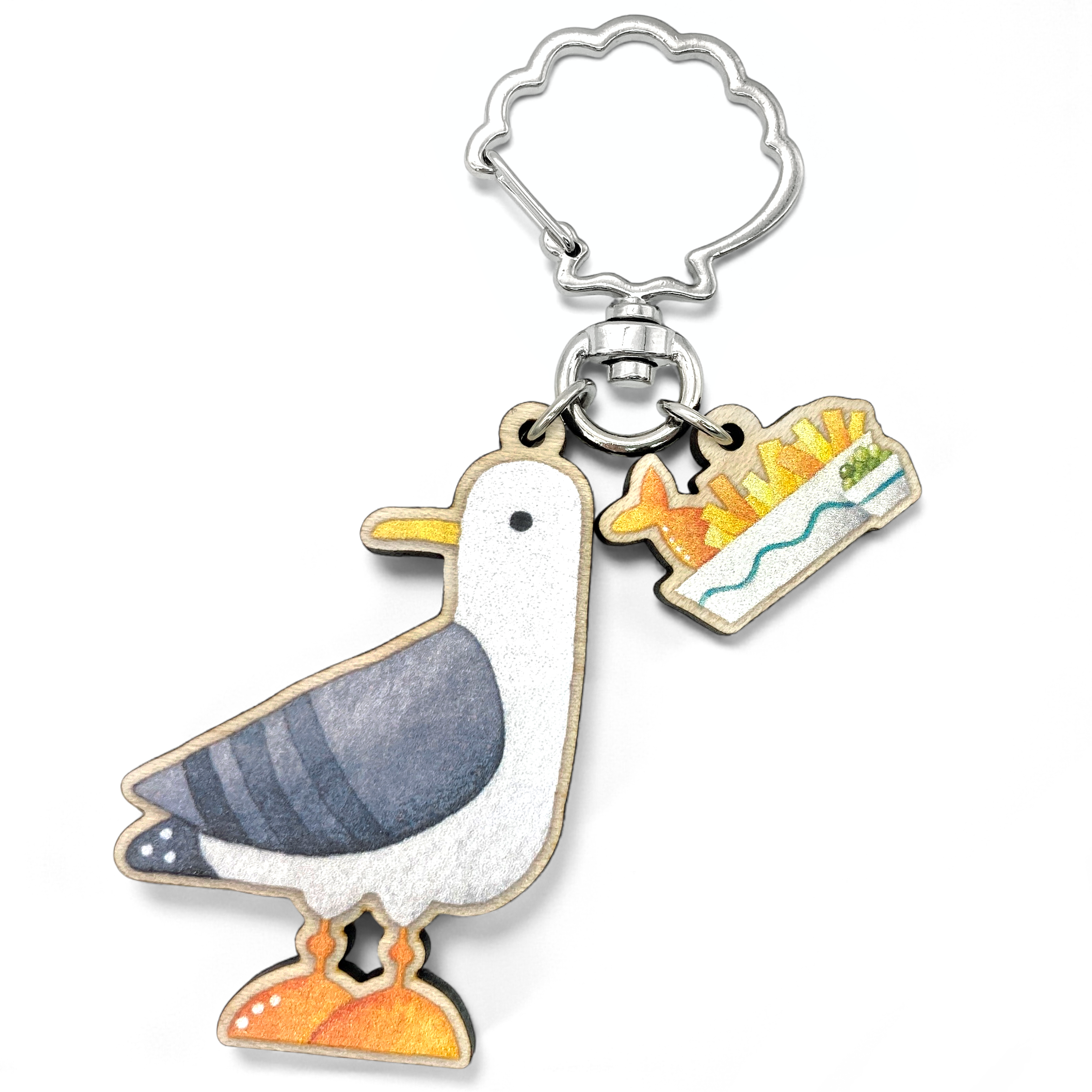 Seagull Greetings Card Bring the joy of seaside living to your shop with this delightful greetings card. Inspired by the colourful charm and adorable wildlife of the East Neuk of Fife in Scotland, this whimsical illustration is taken from an original watercolour, full of vibrant colour and seaside fun. This card features a mischievous seagull, eagerly eyeing some fish and chips, a tiny ice cream cone and some purple seaweed. Product Details: Blank inside – perfect for any occasion Size: 14.8cm square Includes a white envelope Eco-friendly – wrapped in a biodegradable cello bag Versatile – big enough for longer messages