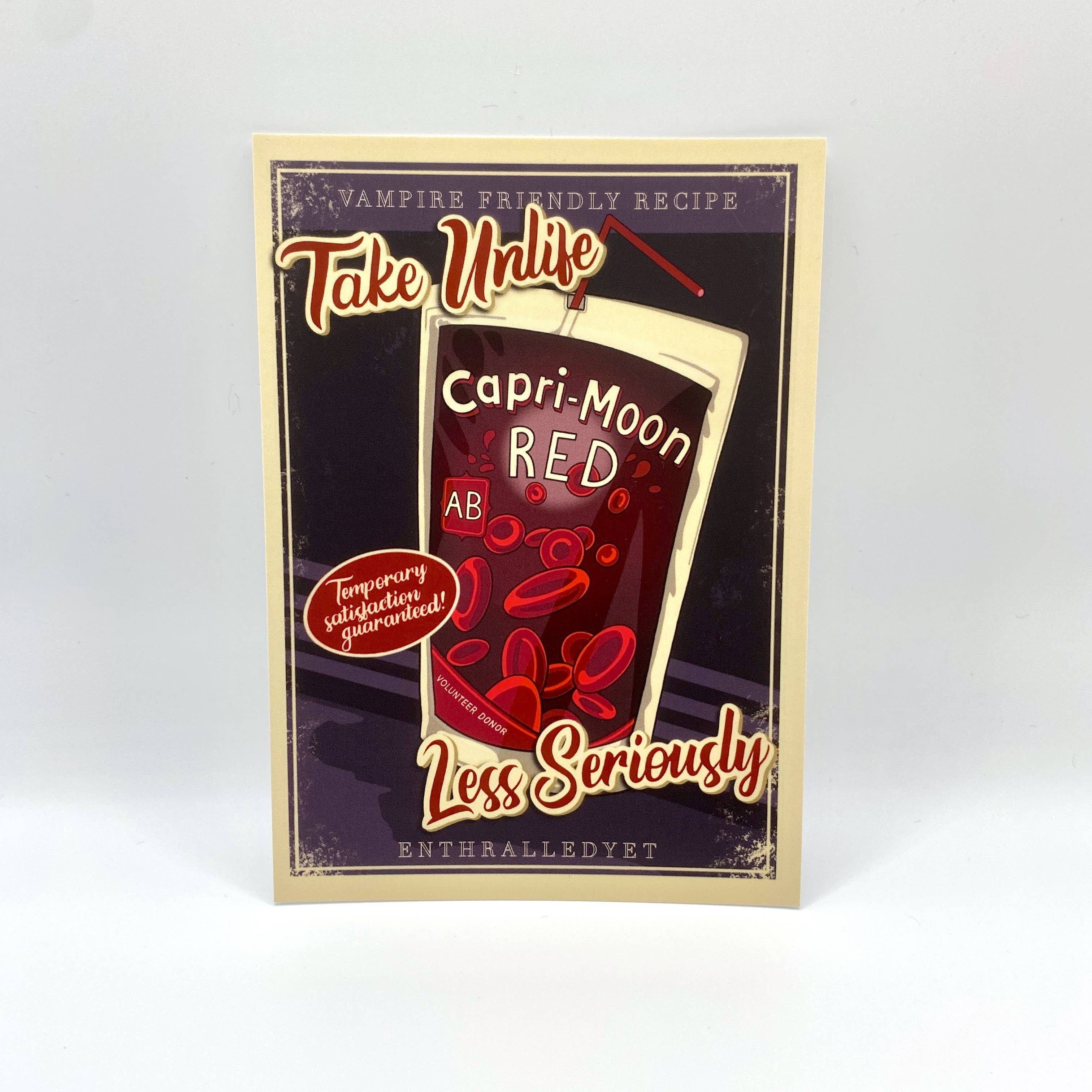 Quoted from Dracula, The Blood Is The Life Print will upset your friends, loved ones and more when you proudly display this haunting artwork in your haven, castle or cubicle at work. Product Details: - 105mm x 148mm / 4.1in x 5.8in. - Printed on premium Soft Touch cardstock. - One sided design.