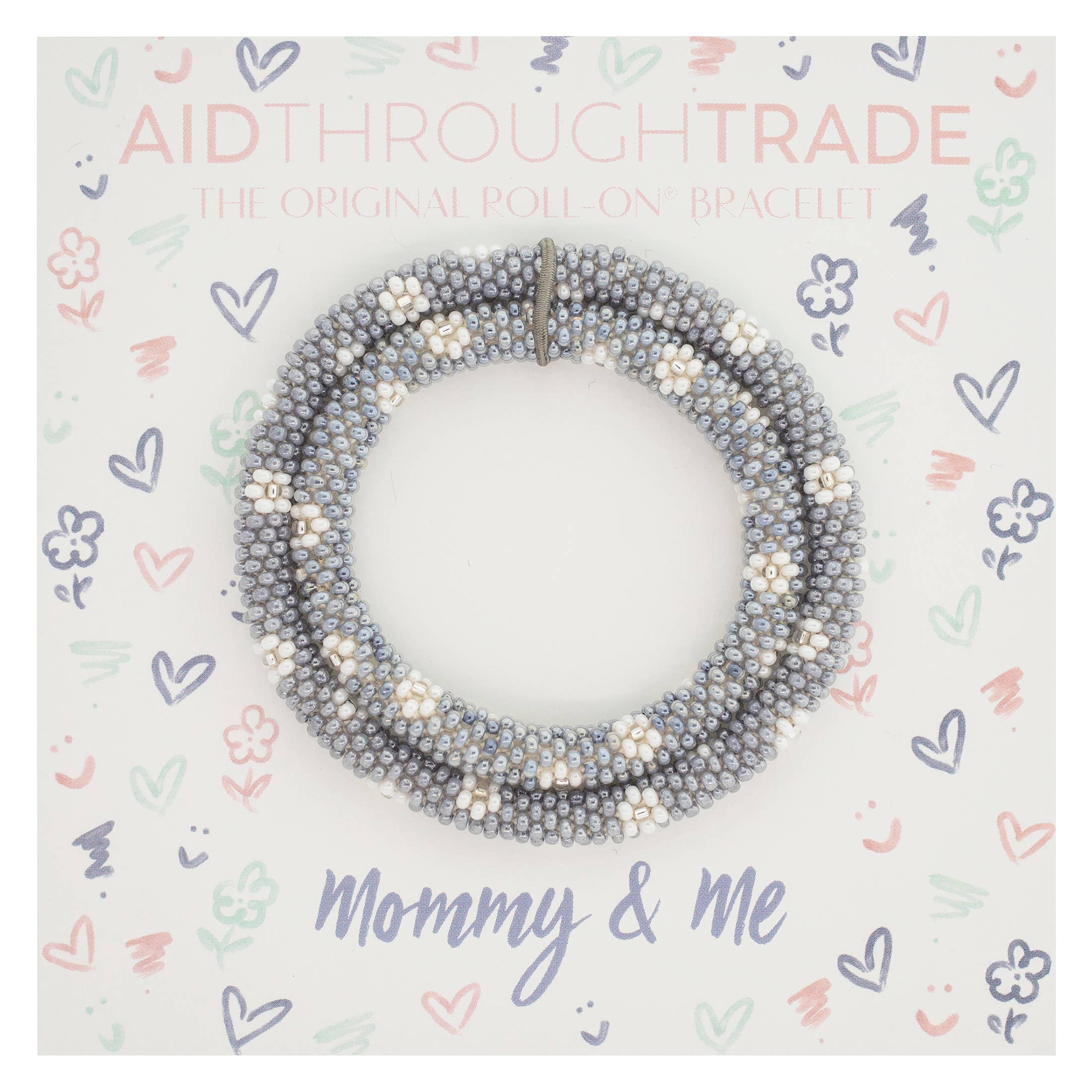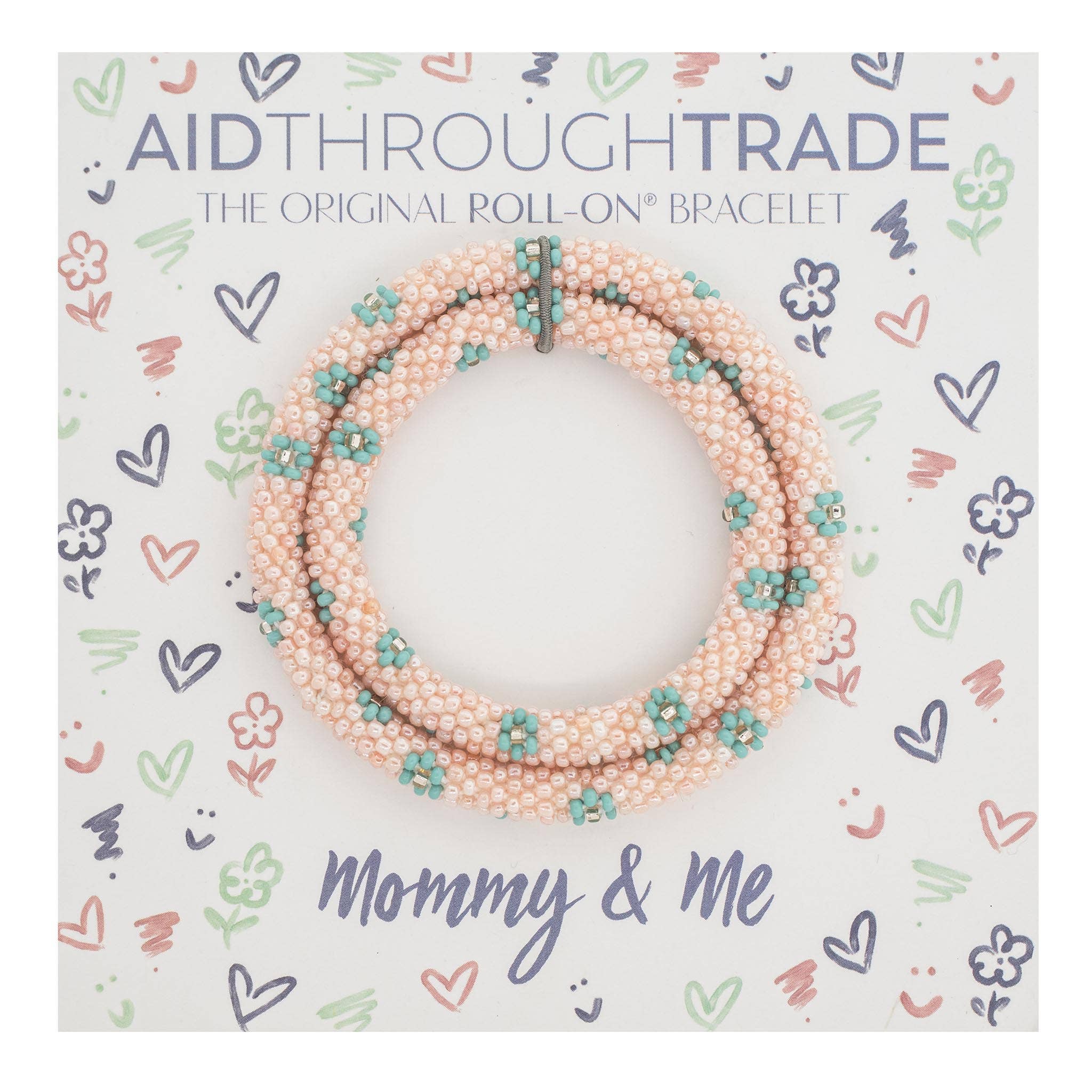 Our Teacup Roll-On® Mommy and Me Bracelets are the perfect addition to your child's next tea party. The pink, gold, and white are the teacup colors of your dreams. This handmade set is just the match you need. These bracelets are exactly what your outfit needs. - The Original Roll-On® Bracelet - Set of 2 bracelets - 1 adult 7” size, 1 kid 6” size - Lifetime Guarantee - Ethically Crafted by our women artisans in Nepal - High quality glass beads and hand-dyed cotton thread - Expands over your hand to fit most wrists - Aid Through Trade is a Founding Member of the Fair Trade Federation and is the only authorized provider of Fair Trade Roll-On® Bracelets