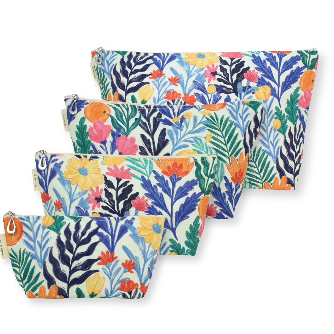 Brand New! A full set of our new Grid Vinyl Makeup Bag includes one small, one medium and one large. They can nest together. For additional sizes, look at our Dopp Kits and the XL Makeup Bag. These cosmetic bags are perfect for travel, stadium events that require clear bags, and everyday use! Features 3 fun, colorful zipper options! Measuring 4" x 7", 5" x 9" and 6" x 10". Wipe clean. Handmade in Portland, Oregon.