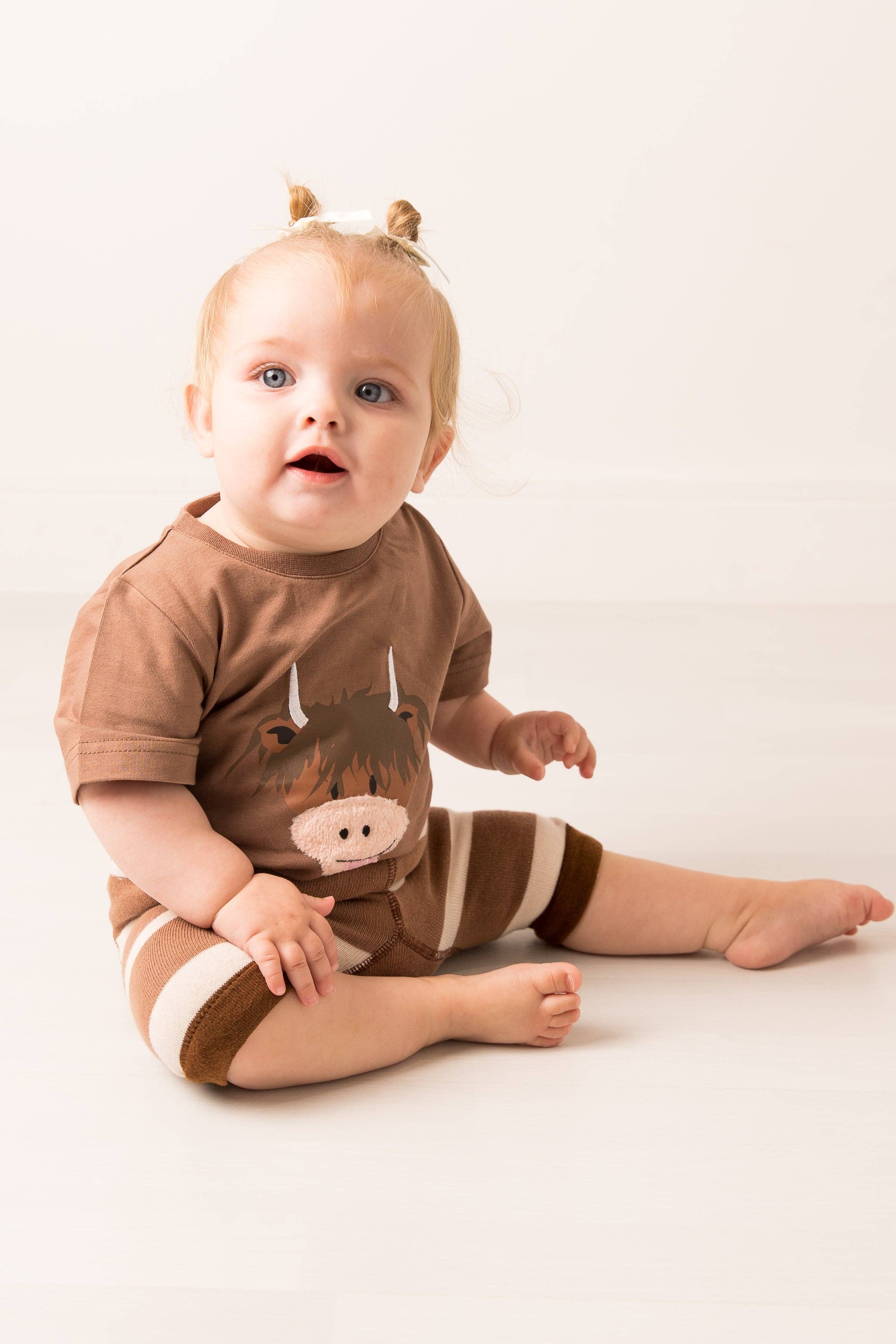 Cuddly soft outfit with a beige sweatshirt featuring an orange heart on the front. It comes with comfortable elastic beige/orange striped leggings. The sleeves of the sweatshirt have elastic ribbed cuffs. Thanks to the cotton blend, the sweater is pleasantly soft on the skin. For sizes 62/68 to 86/92, there are two hidden snap buttons at the neckline, allowing the head opening to be expanded for easy dressing. The leggings fit snugly and are super comfortable. Thanks to the folded hem, you can slightly adjust the size. Are you unsure which sweatshirt size is right for your child? Then feel free to check out our size chart. Sweatshirt: made of 80% cotton, 20% polyester Leggings: made of 95% cotton, 5% polyester, 2x2 rib