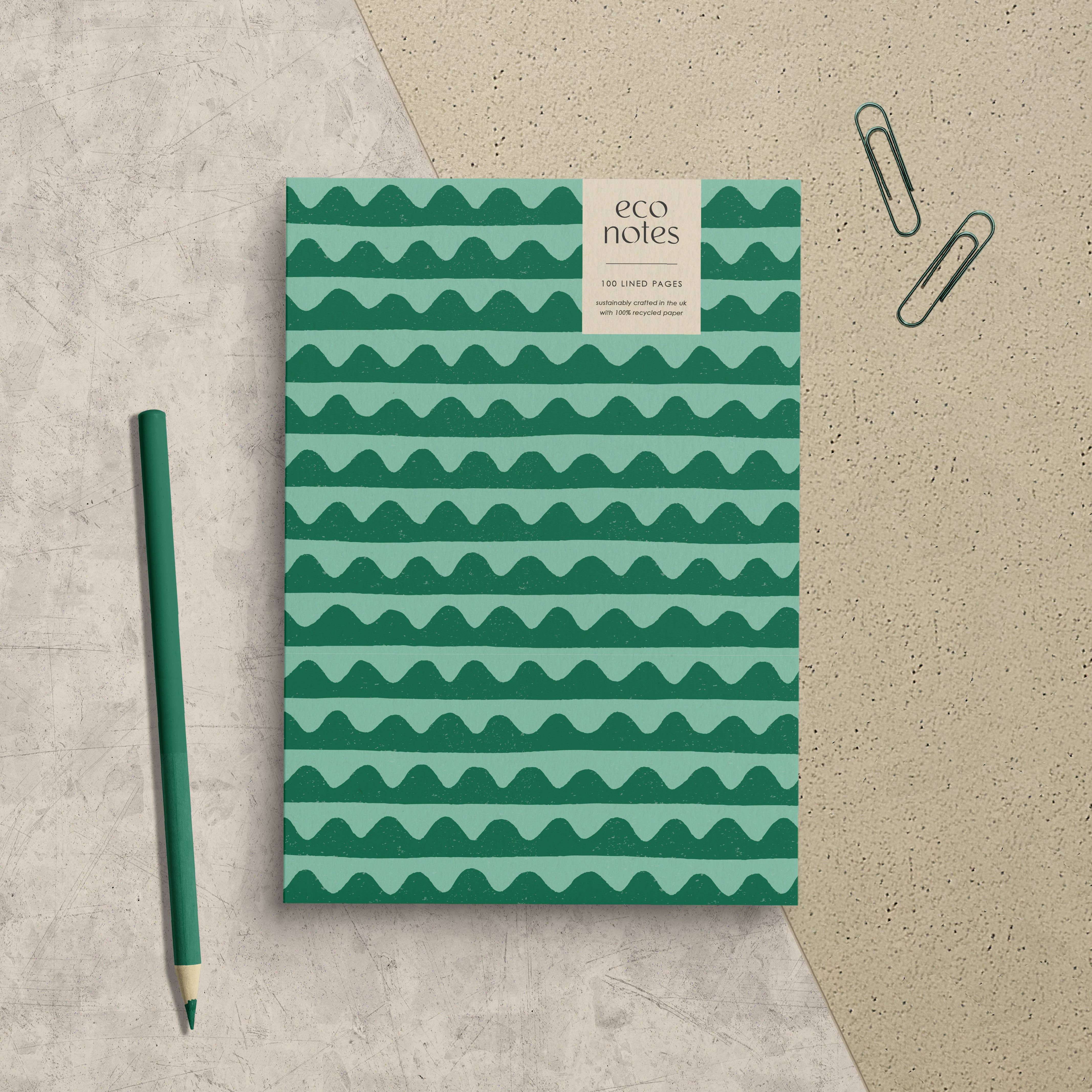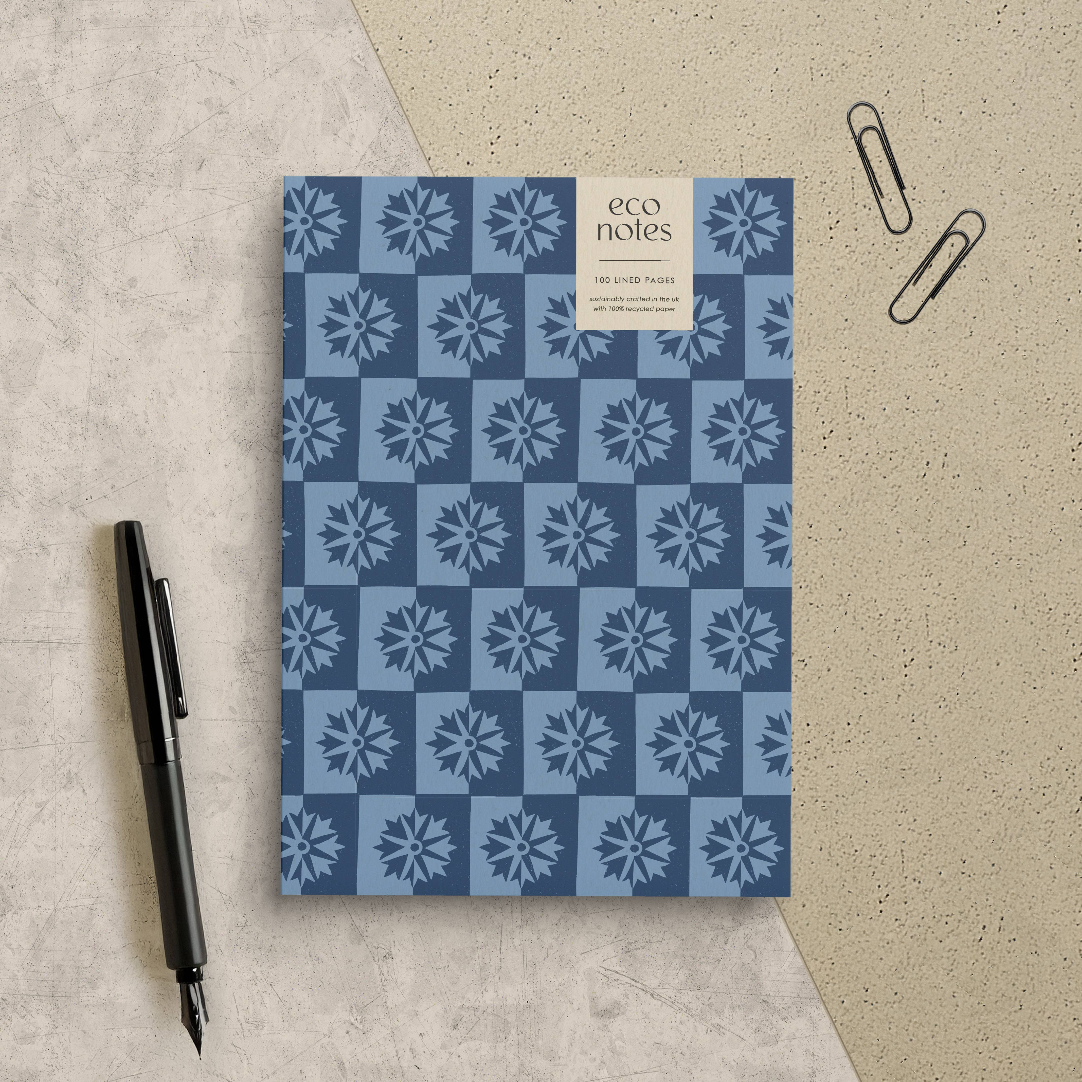 ECO NOTES Inspired by British wildflowers, this geometric take on the cheery dandelion creates a sophisticated, modern-retro design. Illustrated by Emily Byrd, these beautifully-crafted patterned notebooks are made sustainably in the UK using 100% recycled paper. Luxuriously thick textured cover (300gsm) Smooth inner pages with a warm natural colour & gently flecked appearance (100gsm) Size: A5 = 148 x 210mm (5.8” x 8.3”) Perfect Bound 100 Lined Pages FSC 100% Recycled Paper Plastic-Free & Fully Recyclable Made in the UK