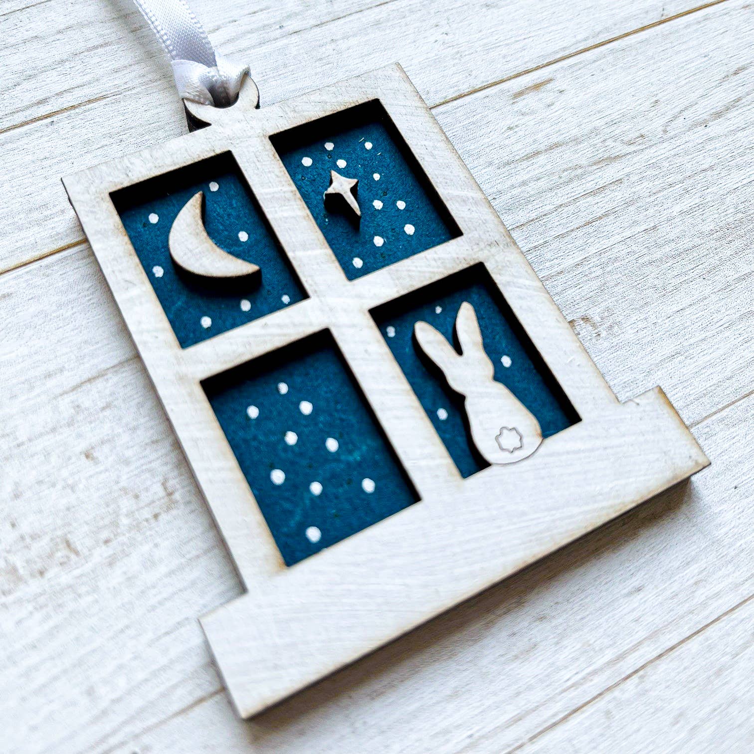 Moon Hare Decoration White moon hare looking at full moon. - 6.5 x 6.5 x 0.6cm - White Ribbon - This version is not customised