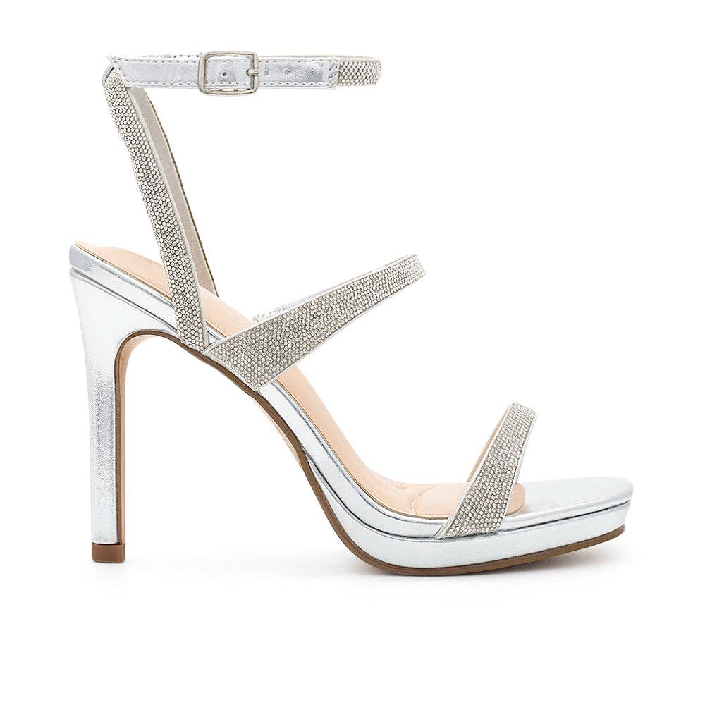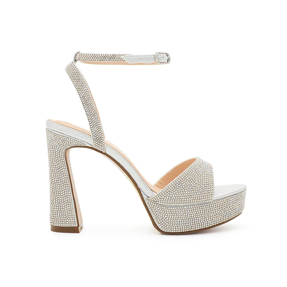 Dallas 1. Elegant block heel sandal with shimmering rhinestone straps that crisscross over the foot, creating a dazzling effect. A secure ankle buckle and platform base make it ideal for quinceañeras, proms, or weddings.