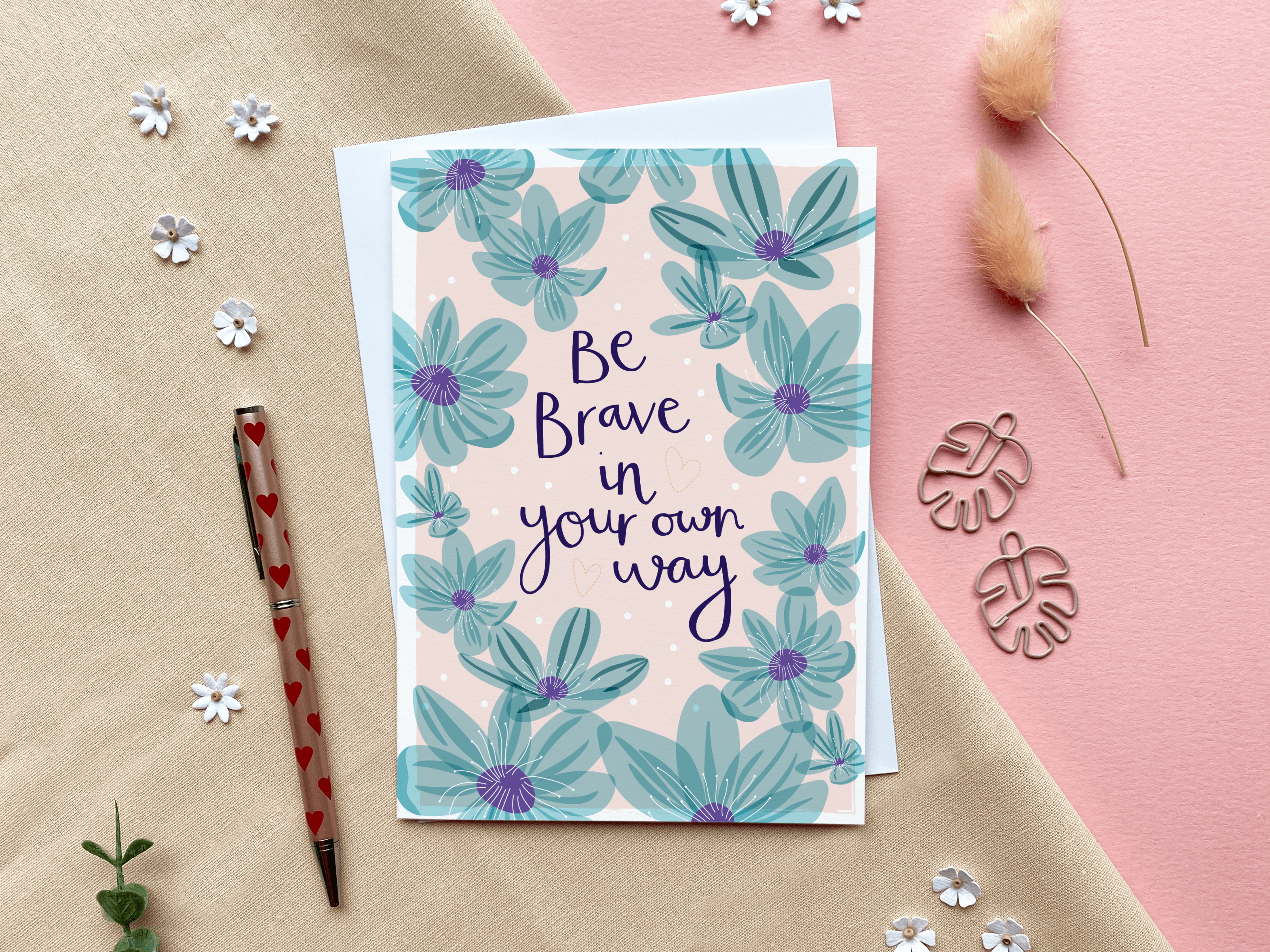 A heartfelt card to send to someone not feeling themselves. It features an envelope bursting with florals, and the message ‘Hope you’re feeing back to your amazing self soon xxx’ This card is part of my Everbloom collection, over 30 greeting cards covering birthday, thank you, engagement, wedding, milestone birthdays, and a whole range of flat wrap. This card is A6 in size. It is proudly printed in the UK in a planet friendly factory, onto beautifully textured GF Smith board. There is no message inside. It is paired with a beautiful olive green envelope.