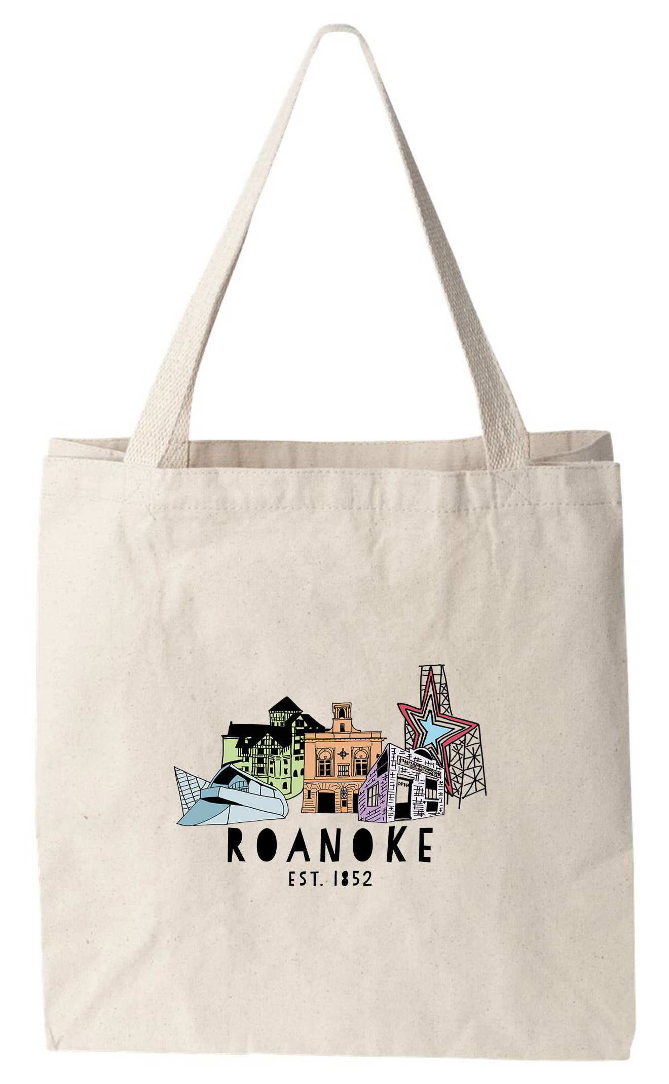 NON-TOXIC MATERIALS: 100% pure cotton and printed with non-toxic ink at our Asheville, NC location. FEATURES: These full-color totes measure 14" x 15" with an imprint size of 8"W x 10"H. Lots of room for all the things! Self-fabric handles are reinforced at stress points for extra durability and support. This is a Moonlight Makers original, designed and screen-printed by artists in Asheville, NC. KEYWORDS: library bag, teacher bag, book bag, party bag, gym bag, holiday bag, handmade, idea, sustainable, grocery, pool, swim, gym, beach, him, her, ideas, humorous, uplifting, workout, yoga, reusable, gifts, recycled, upcycled, sustainable, ecofriendly, cute colorful tote bags, natural canvas tote bags, reusable tote bags, summer bag, cute tote bag, novelty tote, va, roanoke gift, roanoke bag, roa bag, roanoke souvenir, cotton tote bag, roa gift, roanoke merch, roanoke wedding gift, roanoke bachelorette, bachelorette bags, virginia, va bag, roanoke pride, roanoke tote, roa merch, gift