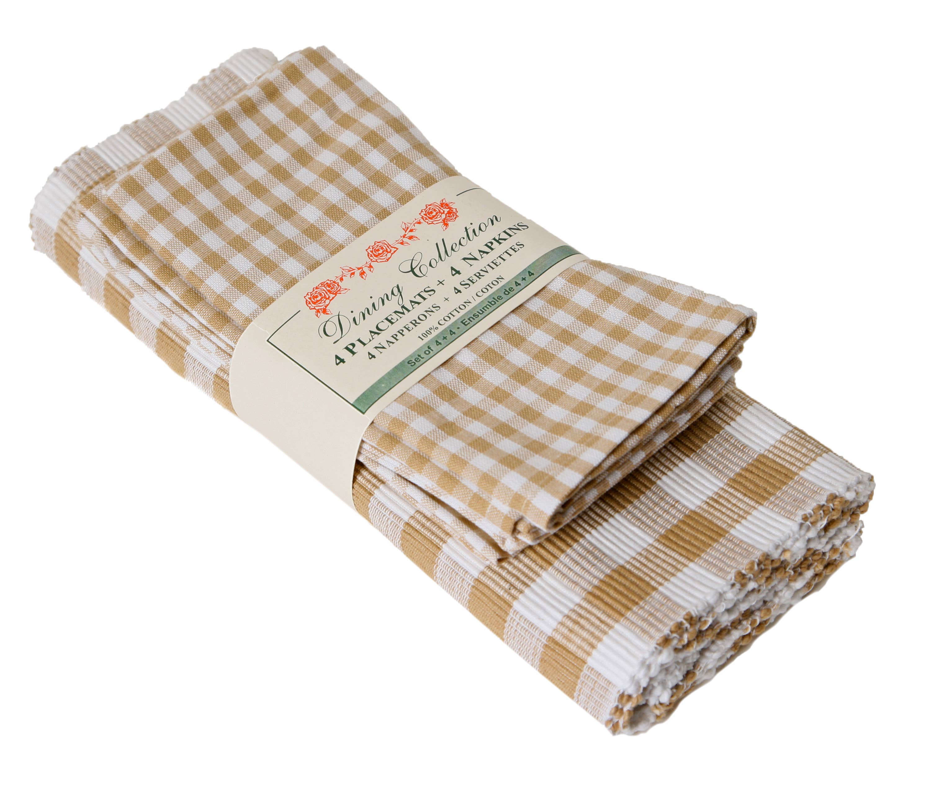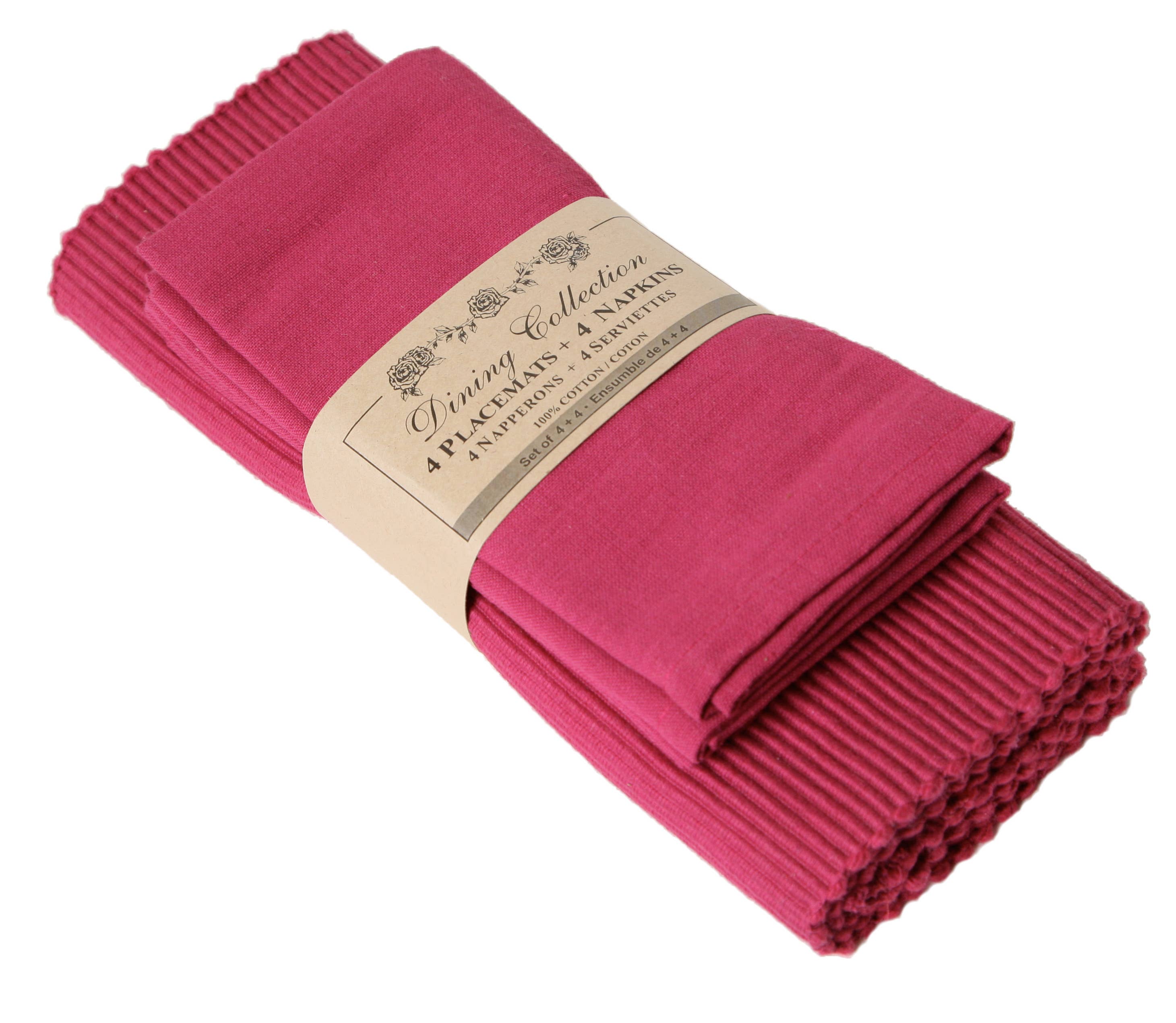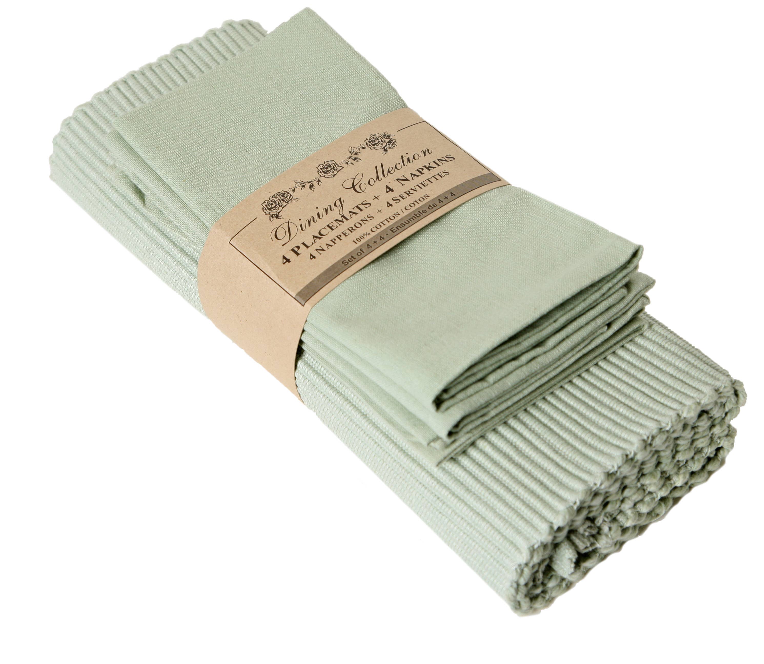 This item was inspired by the request of customers who want designer accented items in the kitchen to add a little countryside charm. This set consists of 4 placemats and 4 napkins packed as a bundle. Solid color Ribbed Placemats and Fabric Napkins Hemmed Finish. 100% cotton. Machine washable. Placemat size: 13"x19" Napkin size: 18"x18 "