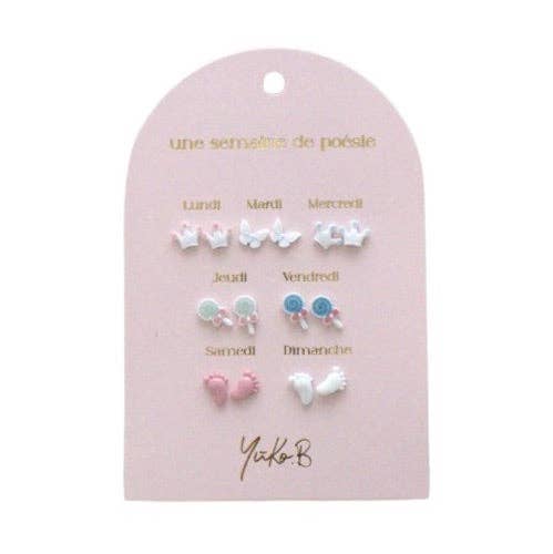 BESTSELLER ALERT! Discover our poetic symphony... 25 cards of 12 and 7 pairs of ceramic earrings with stainless steel posts (nickel-free), including one pair per month of the year from January to December or one pair per weekday. A poetry that comes in two parts: - 6 models of annual cards of 12 pairs: (3 pink cards - 2 red - 2 blue - 2 green - 2 yellow - 2 purple) - 6 models x 2 copies of weekly calendars of 7 pairs: (2 heart-themed, 2 flower-themed, 2 star-themed, 2 luck-themed, 2 Baby Shower and 2 Ocean) Free premium wooden display 🔥 (dimensions: 34x24x2cm) Unit price of the card with 12 pairs of earrings: €19.95 incl. VAT Unit price of the card with 7 pairs of earrings: €14.95 incl. VAT Perfect for: Fashion accessories - Ear accessories - Children's fashion - Birthday - Children's gifts - Girls' gifts - Children's jewelry - Princesses - Occasions - French brand