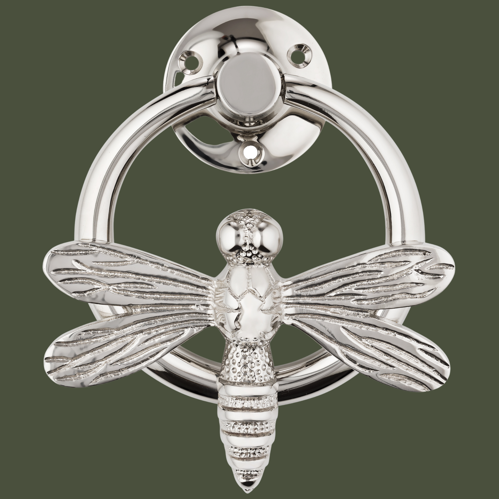 Bee with Ring Door Knocker - Satin Finish Complete with Fixing Screws View our range of matching drawer knobs . Our Brass bee with ring door knocker is certain to bring a smile to everyone who arrives at your front door. Our Copyrighted Brass bee with ring door knockers are all hand made from solid brass and crafted using traditional techniques. . The Bee’s unique and beautiful shape designed by us at Brass bee features a beautiful finish, detailed wings and of course our famous shiny stripes running across the body. The wings and body of the bee are attached to the ring, whilst the striking plate is separate and attached to the door so the bee can knock on the plate and create the perfect knock.