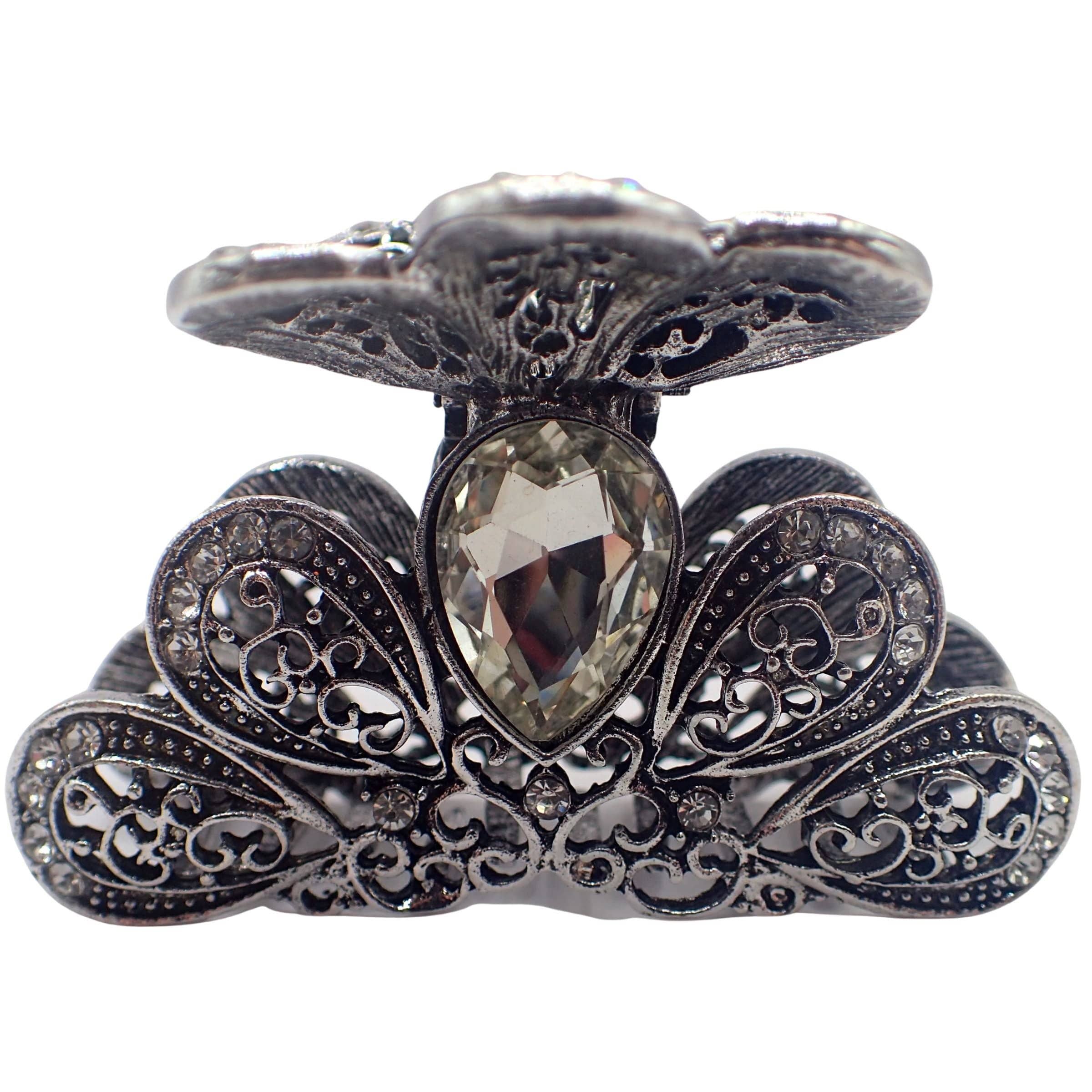 These sparkly vintage style hair barrettes are just the thing when you want to add some bling to your hair! These ornate antique style hair accessories look just as good genuine diamond, silver and gold but at a fraction of the cost. Here are some useful tips regarding barrette style clipping mechanisms: it is quite natural for this type of mechanism of this material to need adjustment from time to time. The manipulation required is either by pushing the ears of the fastening together or by separating them - depending on whether clipping too much (obstructing closure) or too little (unclipping too readily). Barrettes also feature a detachable bar in centre of the clip, leave the bar in for use with thin or small amounts of hair and detach it for thick hair and other instances where large amount of hair will fill the clip, the bar can be removed and reinstalled if you wish to use in different ways for differing hairstyles, we supply versatile clips that can be used by all.