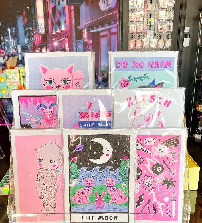 Fantastic products. The stickers are great quality. Easily peel for application. High quality gloss/shimmer/glitter if it applies. The size is a great for the price. All the prints are A4, so frame sizing recommendations are a good thing to have handy for potential customers that any shops have if ordering these. The fact they are printed on recycled coffee filters is a bonus if you're looking to keep things green, too. First order of many and our customers are stoked to have access Amy's work!