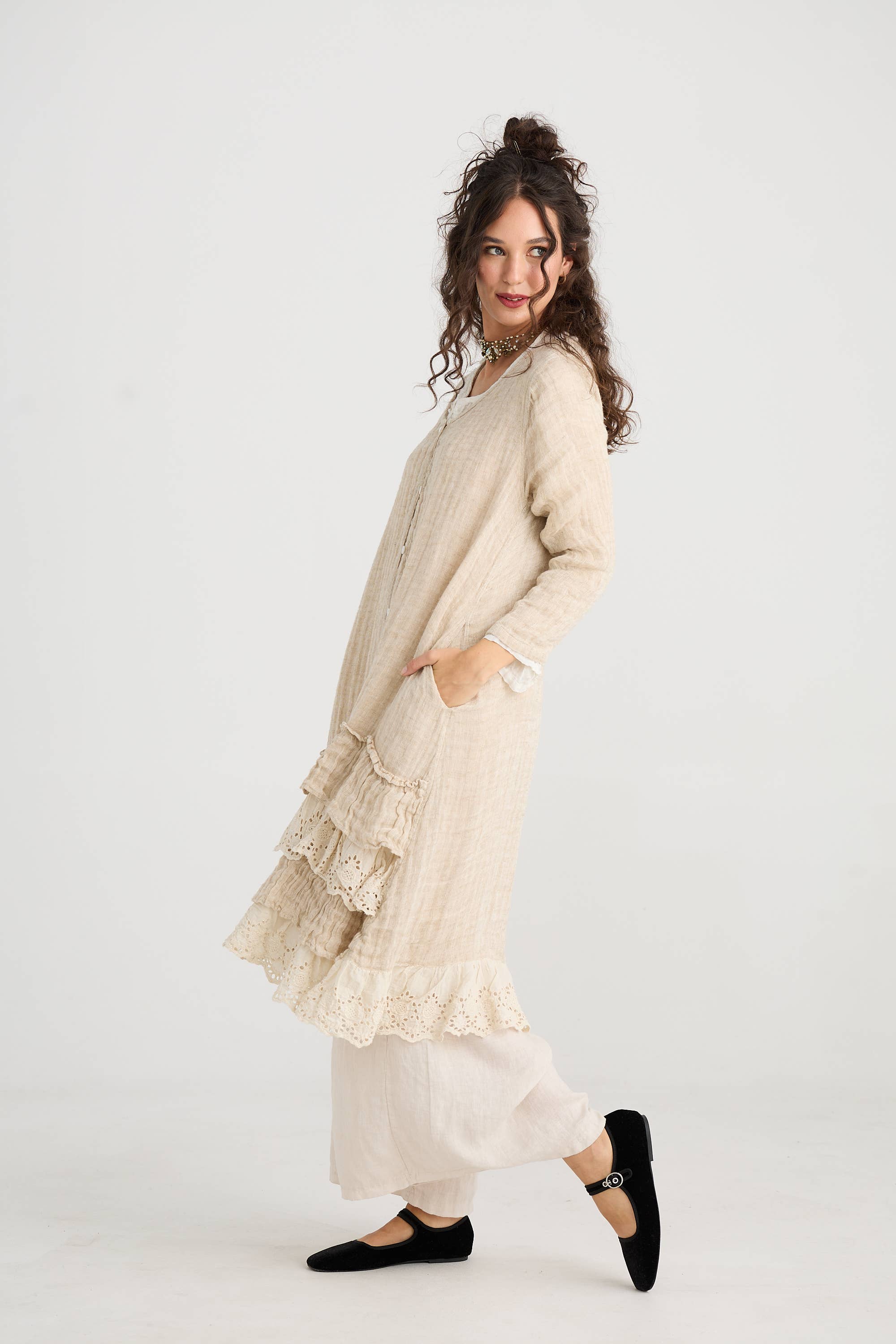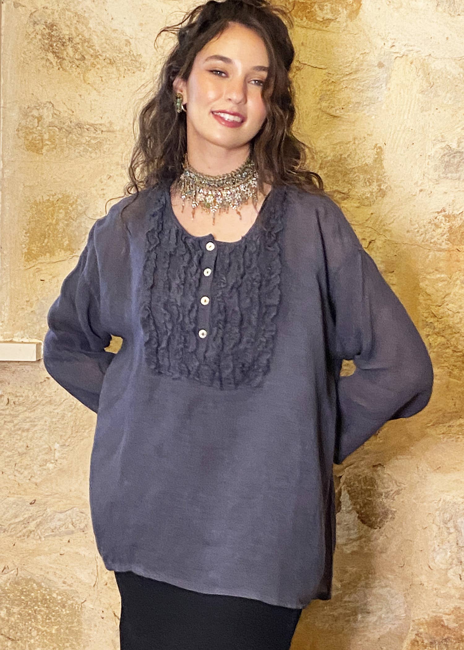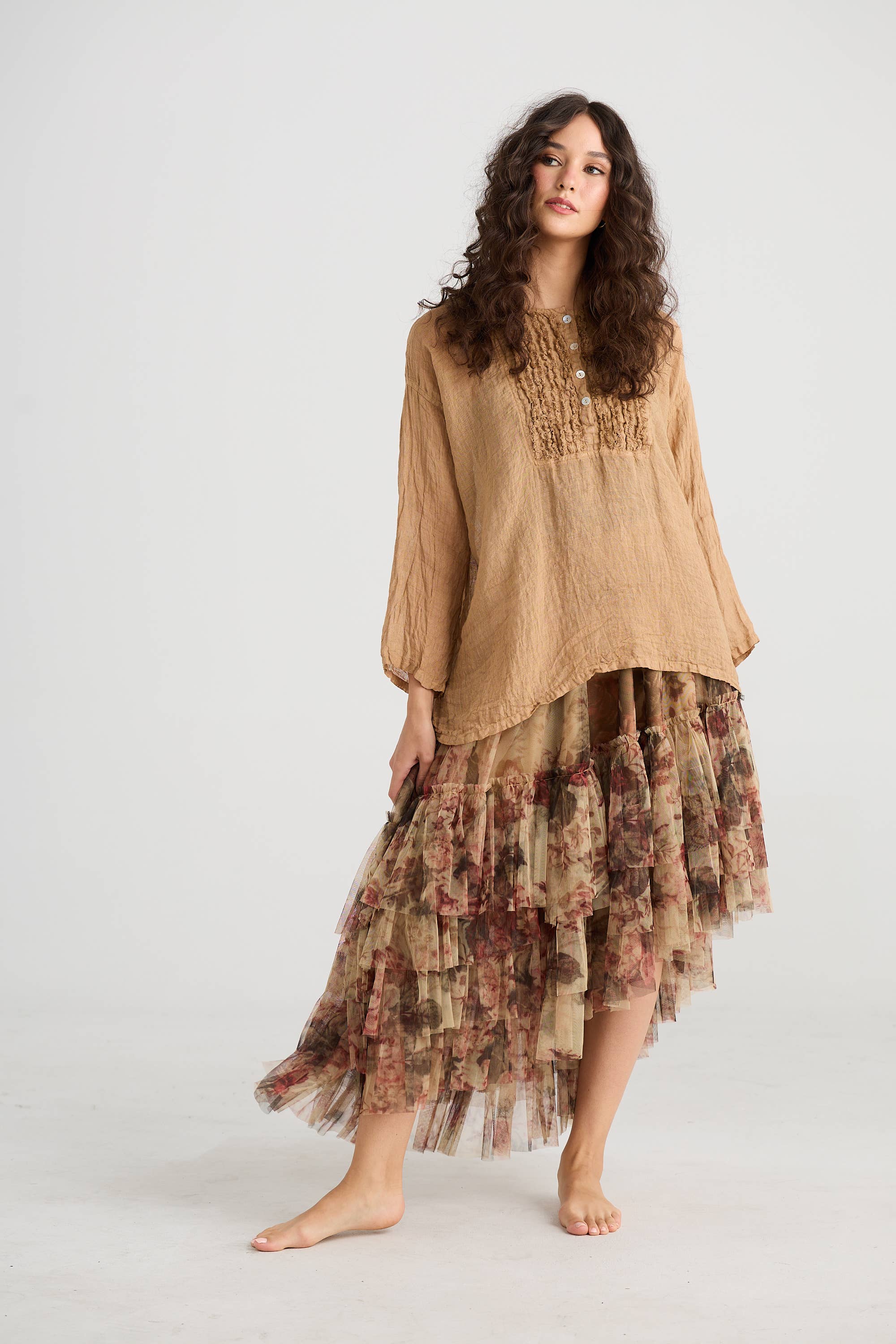 Angelica is just delightful. Made from stiffened linen gauze (but still soft and fluid) this skirt is enchanting with its ruffles and clever "engineering" of the ruffles so that they fall gracefully and flatter the body. This is an elegant skirt, and a versatile one. It can be worn by itself, or layered under a coat-dress or in other ways. With a drawstring waist and basque top, this skirt is in 2 sizes: Small/Medium (to fit to size 12) Med/large (to fit to size 18) The colour is a very classic Stone with Grey Floral Print, and super-easy to wear! We have styled it with the Sahara linen top in Desert Sand.