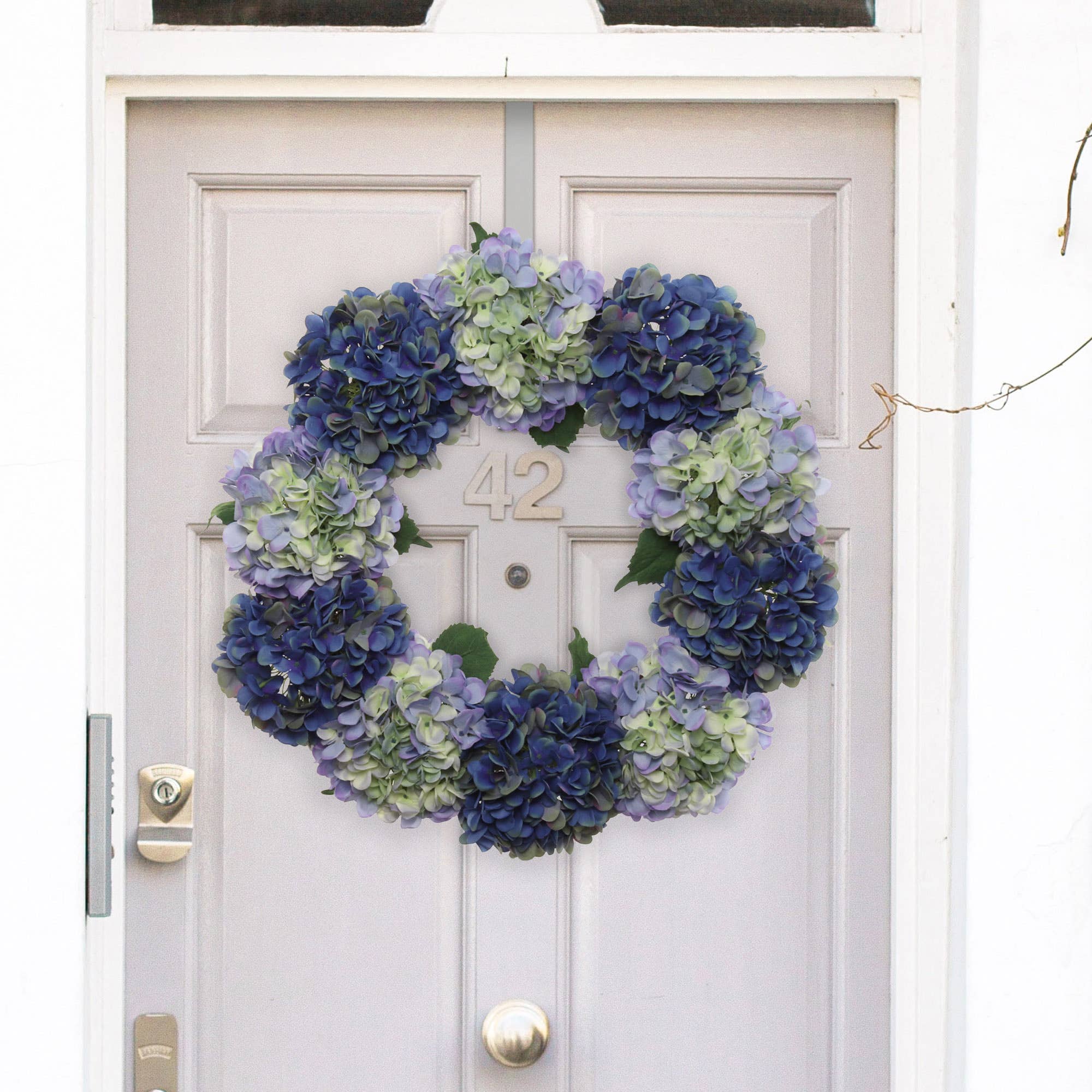 Introducing the cloud white hydrangea wreath, a stunning botanical creation meticulously crafted to adorn your space with timeless elegance and charm. 🌼 radiant beauty: adorned with lush white hydrangea blooms crafted from high-quality silk, this wreath exudes a sense of natural beauty and freshness, bringing a touch of tranquility to any setting. 🌿 lifelike detailing: each silk bloom is intricately designed to mimic the appearance of real hydrangeas, ensuring lifelike realism and lasting vibrancy. 🏡 versatile decor: with a 24" wide grapevine ring, this wreath is perfect for hanging on doors, walls, or mantels, adding a touch of sophistication to any space, whether it's a cozy home or an elegant event venue. Elevate your decor with the cloud white hydrangea wreath, and let its exquisite beauty brighten your surroundings with grace and allure.
