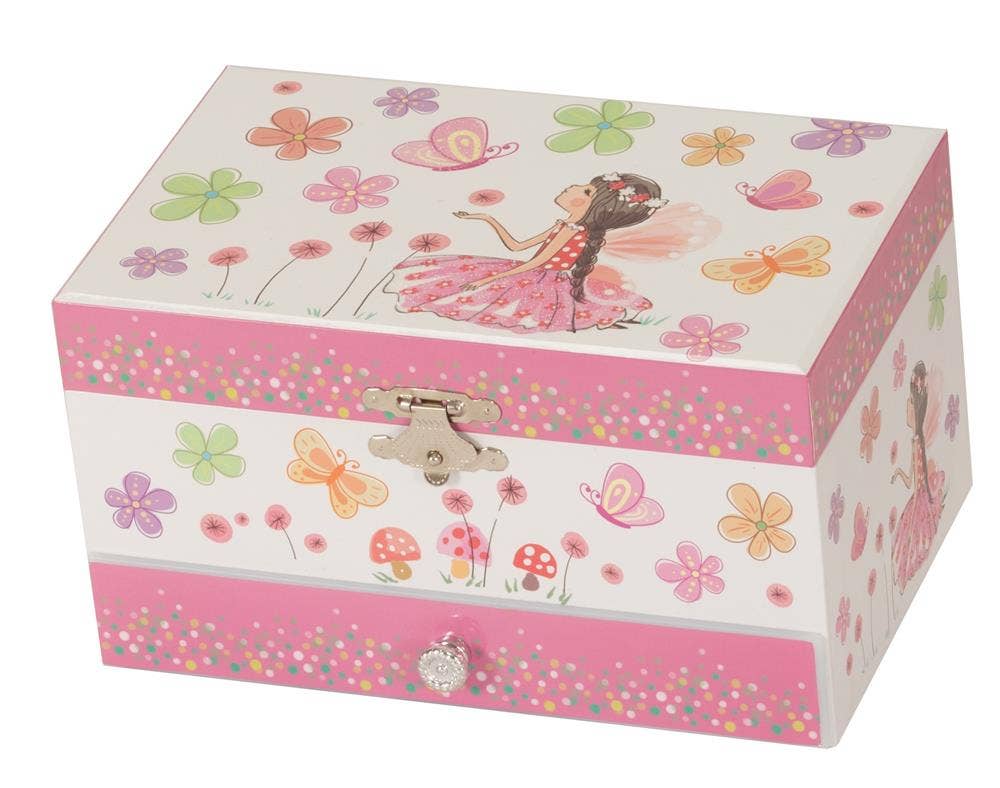 Pretty pink and white musical Ballerina and ballet shoes jewel case Ballerina and ballet shoes design paper-wrapped jewel case with a twirling ballerina. Fully lined with pink flock Silver-tone, fittings, and safety mirror. Dimensions: 15 x 10 x 8.5 cms Prices shown are per piece.