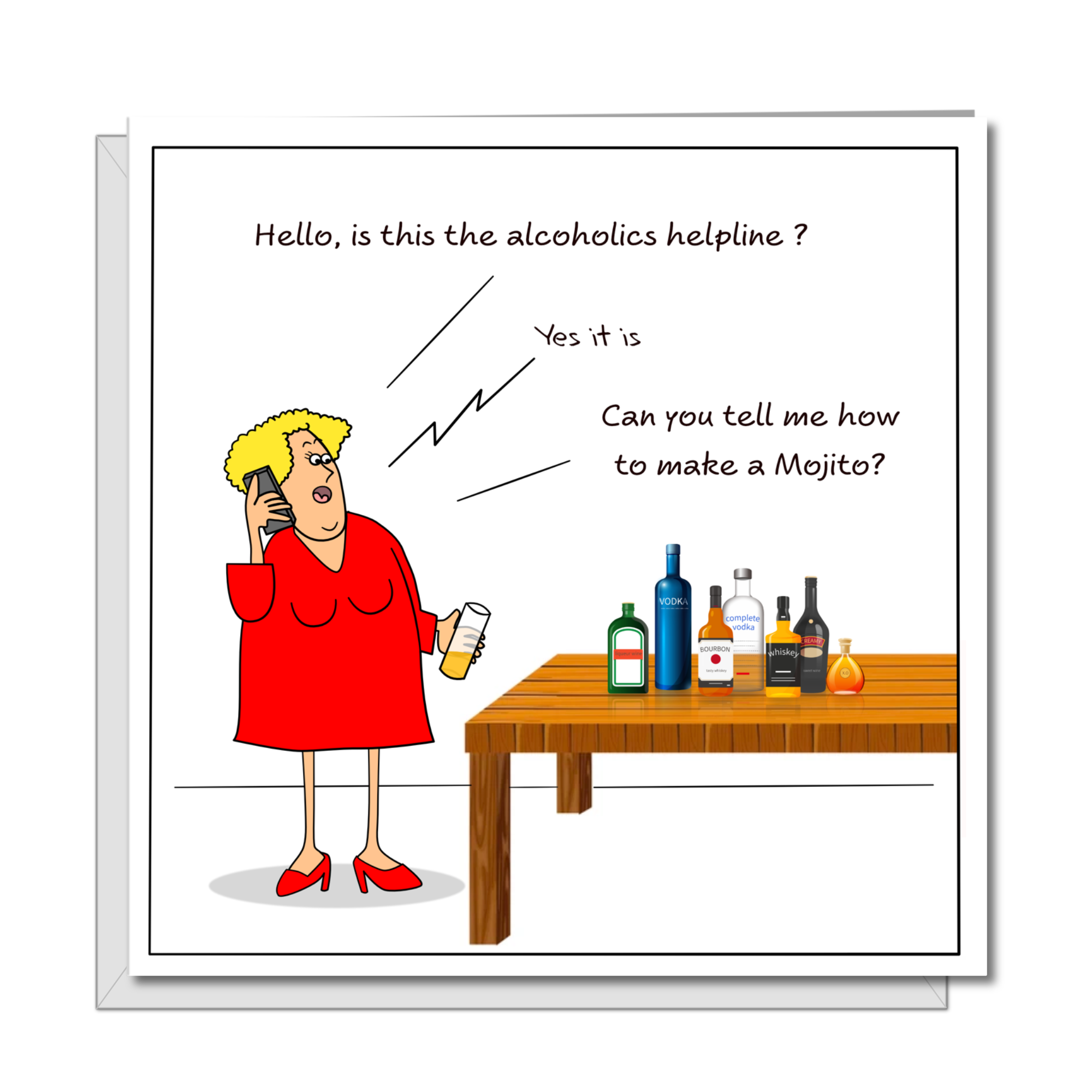 Funny Birthday Card for girl friend, wife, Mum , aunty, bestie or any female friend. Or Mothers Day Card Amusing, humorous and fun. Image: Lady on the phone with a choice of spirits on the table. Wording: "Hello, is this the alcoholics helpline?" "Yes it is?" "Please can you tell me how to make a Mojito?" Blank inside for your personal message Handmade greeting card printed on high-quality card, complete with envelope. Content: 1 x card, 1 x envelope Size: 6 x 6 inches, 152 x 152 mm Card: White hammer finish, 300 gsm Envelope (included): 100 gsm