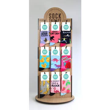 Sock Therapy Bamboo Socks – Put your feet into sock therapy! Bamboo is some kind of magic material. It is cool in the Summer, while still managing to be warm in the Winter. It is also super soft and sustainable too. Like we said…..magic! We add a little Sock Therapy innovation of our own with funky designs and bright colours. The result is a pair of socks you’ll never want to take off! (Seriously though, you should wash them now and then!) Our eco wooden display spinner will look fantastic in your store and is bound to increase sales, even the hooks on this display are made from 100% recycled and recyclable plastic! H: 82cm W: 30CM Holds 18 designs RRP £6.99 Wooden sock display is £37.86, offset at retail with 6 pairs of socks free of charge. Stands made to order so please allow a 7 day lead time. If you wish to specify designs please list them in the notes, otherwise we will stock with best sellers!