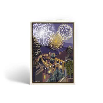 'All Things Bright & Beautiful' depicts fireworks over the small town of Petritoli in the Marche, Italy. I celebrated my birthday there a few years ago and would have loved to see this display. Sadly it is entirely imaginary. These collectable cards are high quality reproductions of my original hand painted artwork. Look carefully and you can spot a spectator looking out of a window. Printed in the UK on lovely cream card, they are blank inside so they can be used year round if you wish. Printed in the UK Blank greetings cards Sold in packs of 5 with envelopes Dimensions: Folded size 10.5 x 15 cms (A6) Materials: Heavyweight 280gsm cream card NB Watermark © Cressida Bell is not part of this design