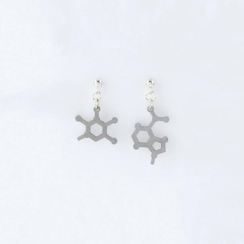 Wholesale guanine and cytosine molecule studs. DNA is made up of a unique combination of adenine, thymine, guanine, and cytosine which only combine in adenine-thymine and guanine-cytosine pairs. This product includes one guanine and one cytosine stud. Stainless steel studs.