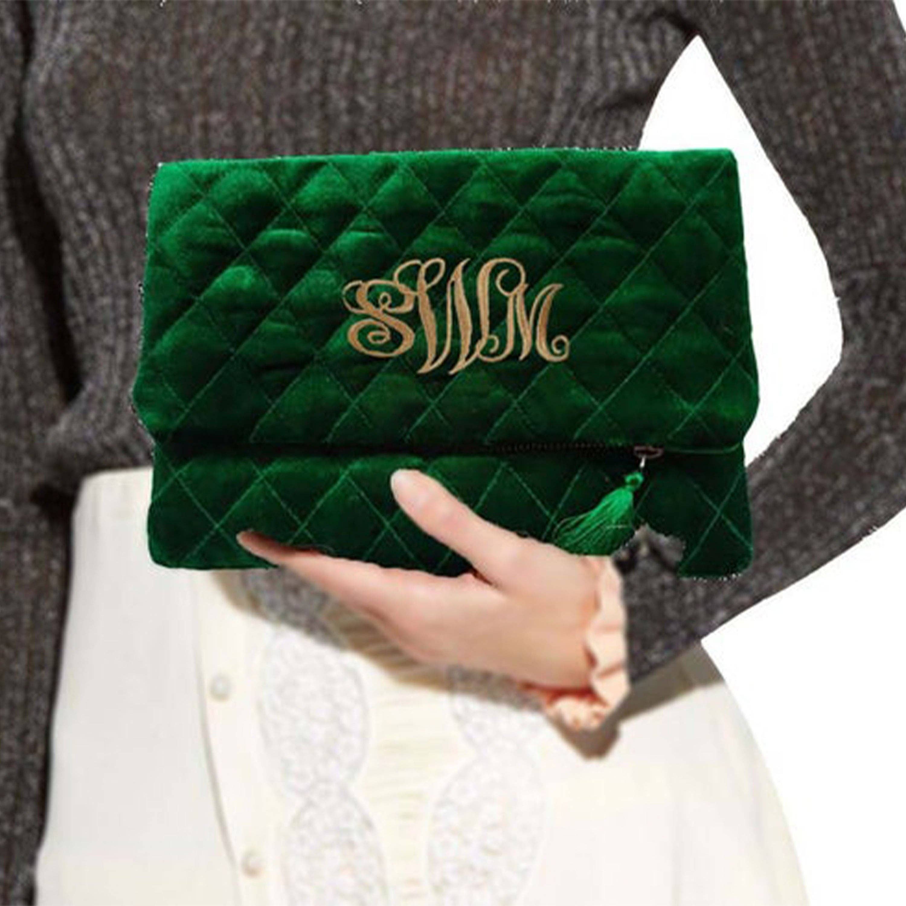 Wholesale Green Velvet Monogram Purse, Monogram Tote, Monogram Purses, Bride To Be Gifts, Personalized Velvet Clutch,New year