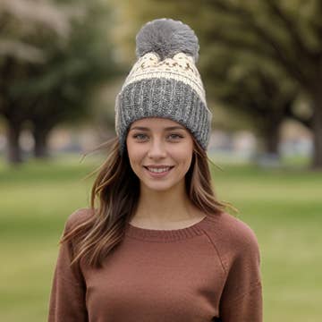 Cream, navy blue, magenta and ochre Fair Isle knit bobble hat with faux fur pom-pom
