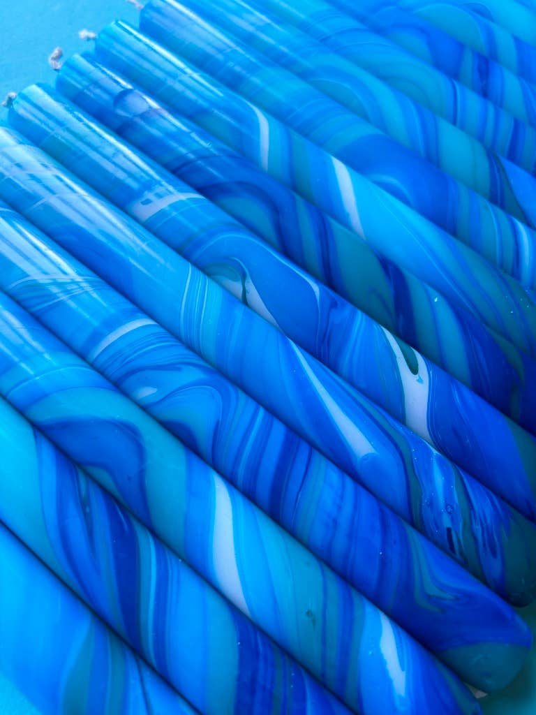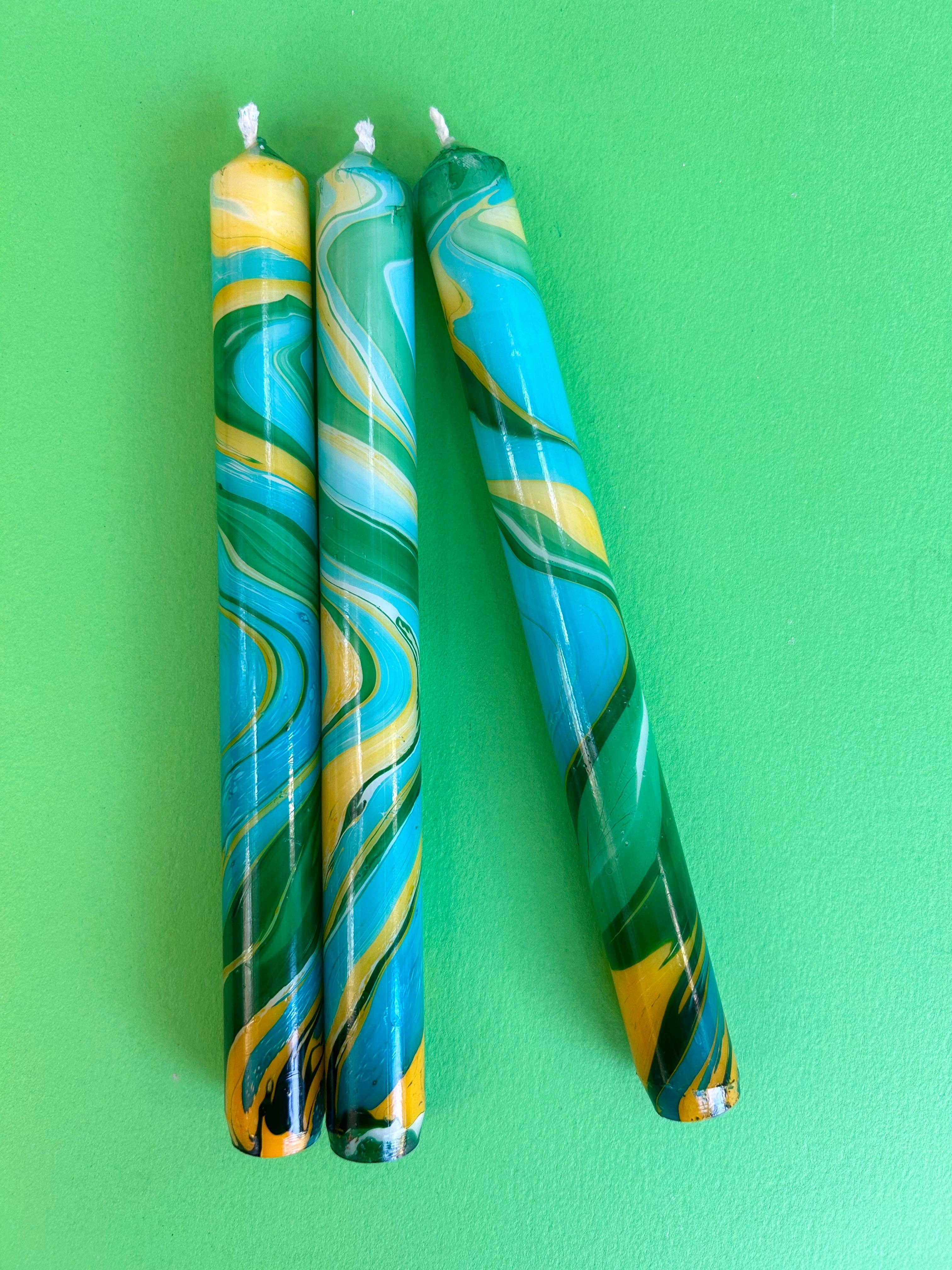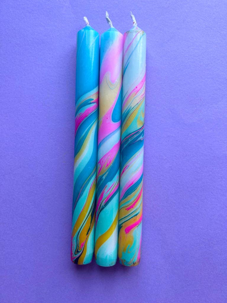 These special and unique, Dip Dyed bright and colourful candles are made in the UK. They make the perfect gifts to adorn the homes of the interior conscious among us. These handmade, marbled, colourful candles made from the paraffin wax which is great for vegans. All of our candles are lovingly hand dipped, which makes them totally individual and produces beautiful swirling patterns. Due to their handmade nature they may have some minor imperfections but we think that this adds to the uniqueness. They make perfect gifts for any occasion and add a brilliant splash of colourful art to a room or a home. - Size = 23cm x 2.3cm (fit most standard candle holders) - Made from paraffin wax - Set of 3