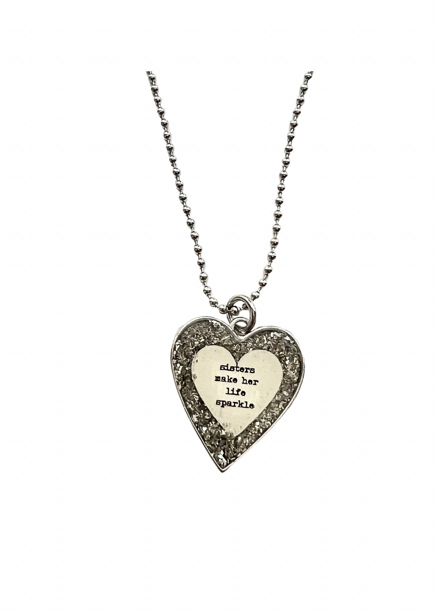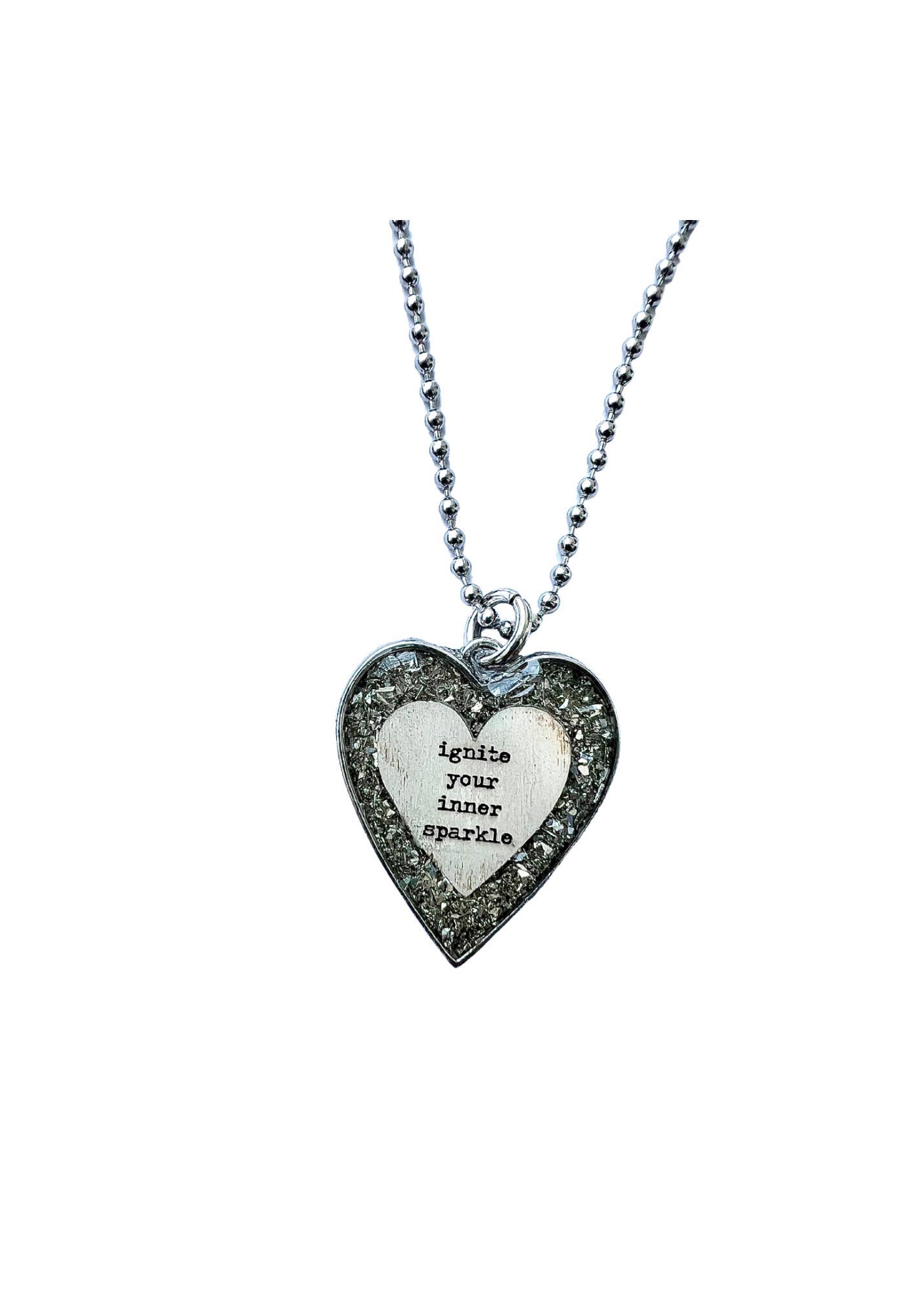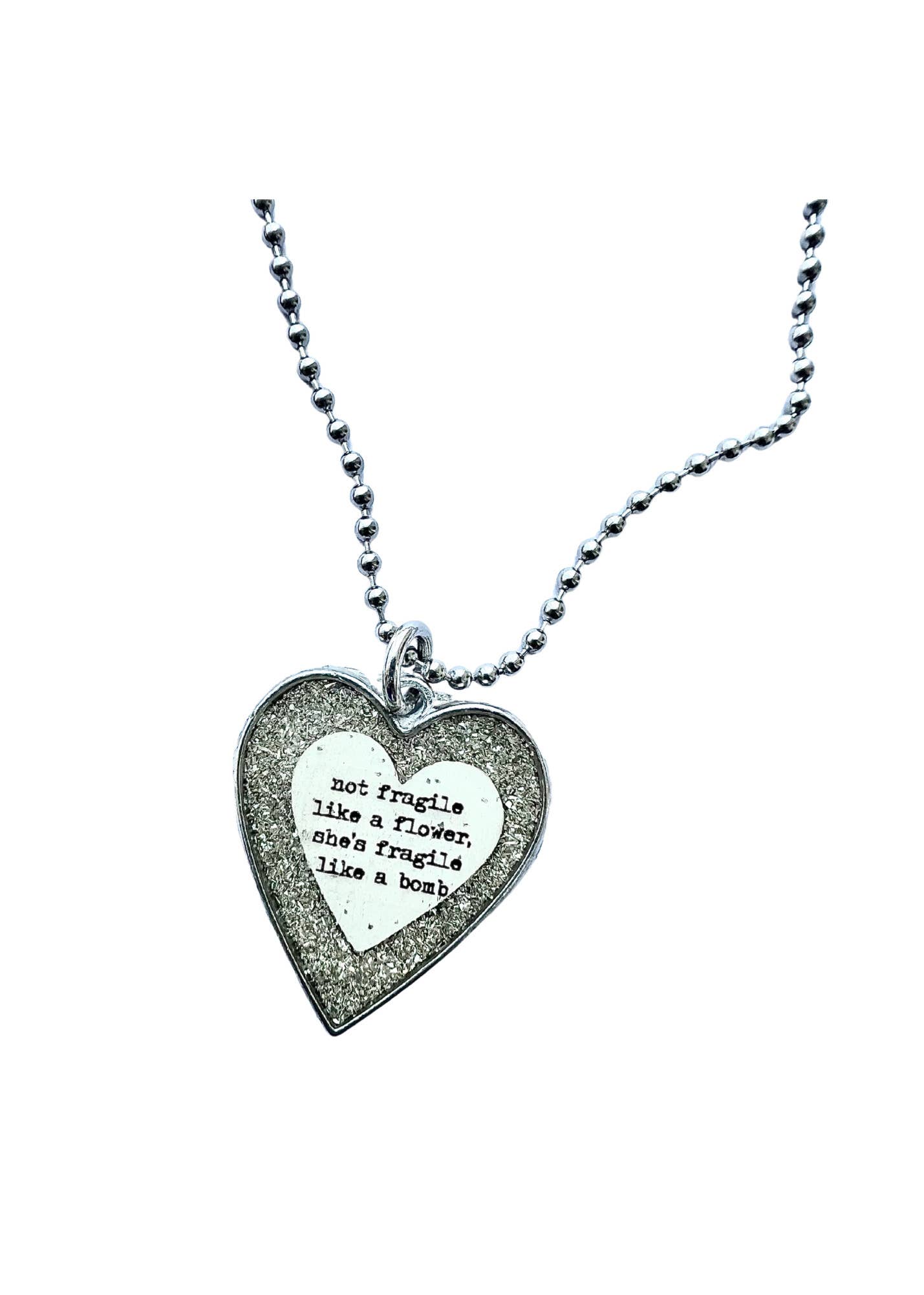 Do you have a little rebel mixed with angel. Sometimes you just need to hide your wings and let loose . This necklace is inspired by the Lainey Wilson song Hold my Halo. Silver glass glitter is inlaid with a hand painted wooden heart and the words "hold my halo". Inspired by country music lyrics .. She will sparkle bright in this sparkly glitter charm. Product Details : 24" stainless steel ballchain included Silver heart with glass glitter