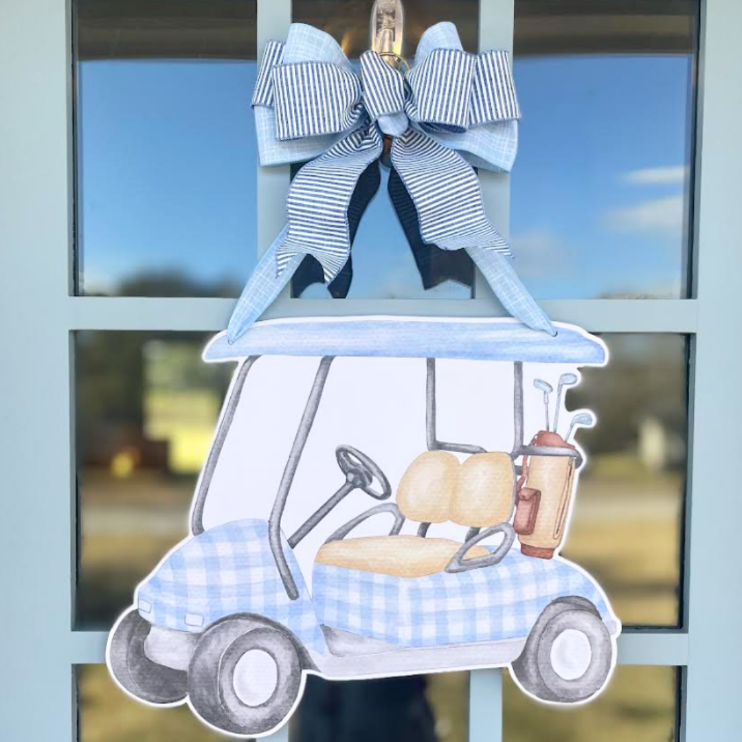 At Front Porch Elegance, we are passionate about creating products that help you Host with Grace and Celebrate in Style! The Tee Time door hanger feature a watercolor golf cart in blue. Perfect for golf themed birthday parties or watching your favorite golfer. Description: * Original Watercolor Art * Measures 20x18" (before addition of hanger/bow) * Comes with handmade ribbon hanger and bow * Great for indoor or outdoor use. * Makes a great closing or housewarming gift! **This high quality door hanger is made of weather resistant material (not wood) with UV resistant ink to last you season after season!** Follow us on Instagram @front.