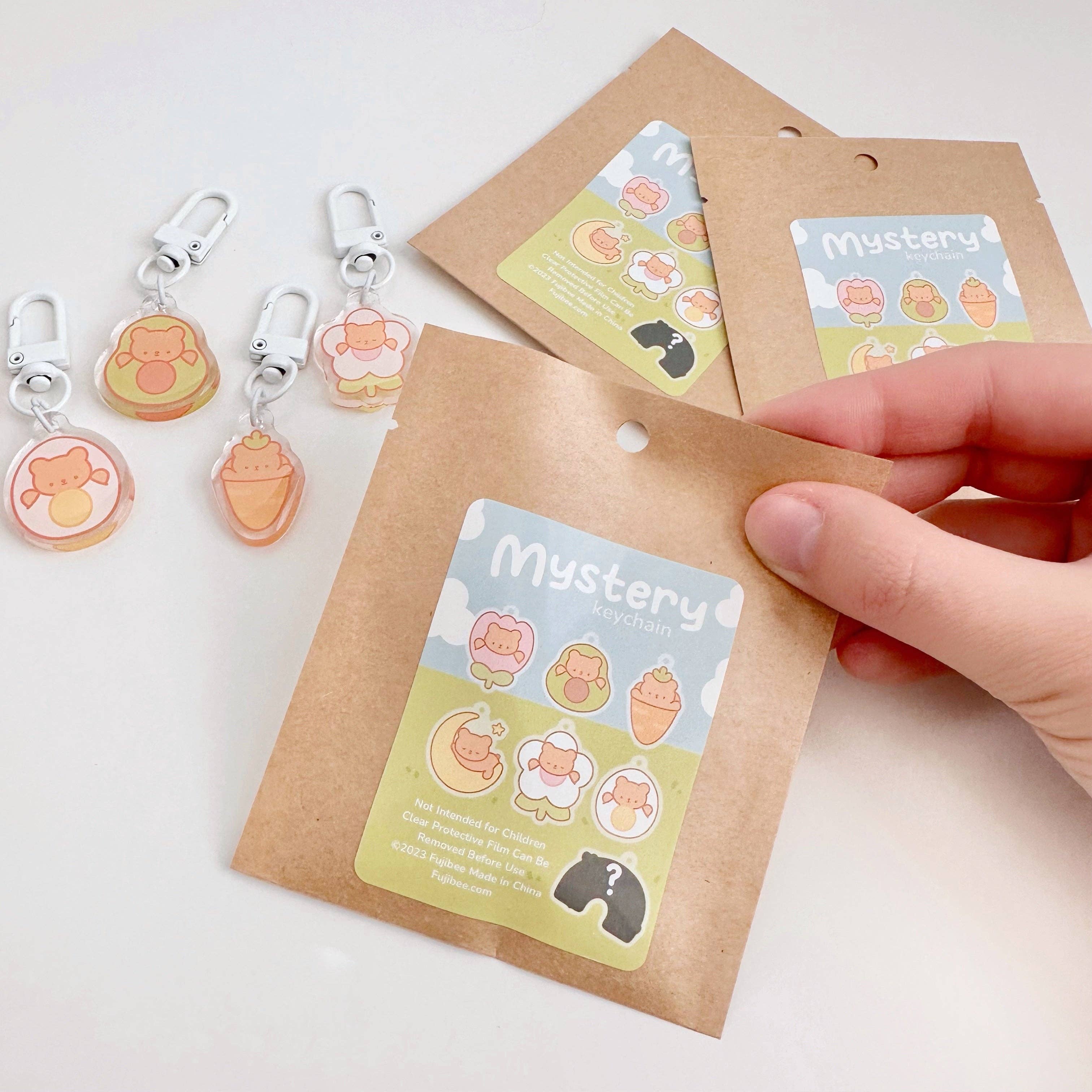 20 Mystery Keychain Blind Bags with free Counter Display Box! Retail is $6 each. __________ Mystery Keychain! 7 designs possible, one mystery 👀 Or buy the full collector's set! 1 inch acrylic charms with glossy epoxy coating Metal spring clasp