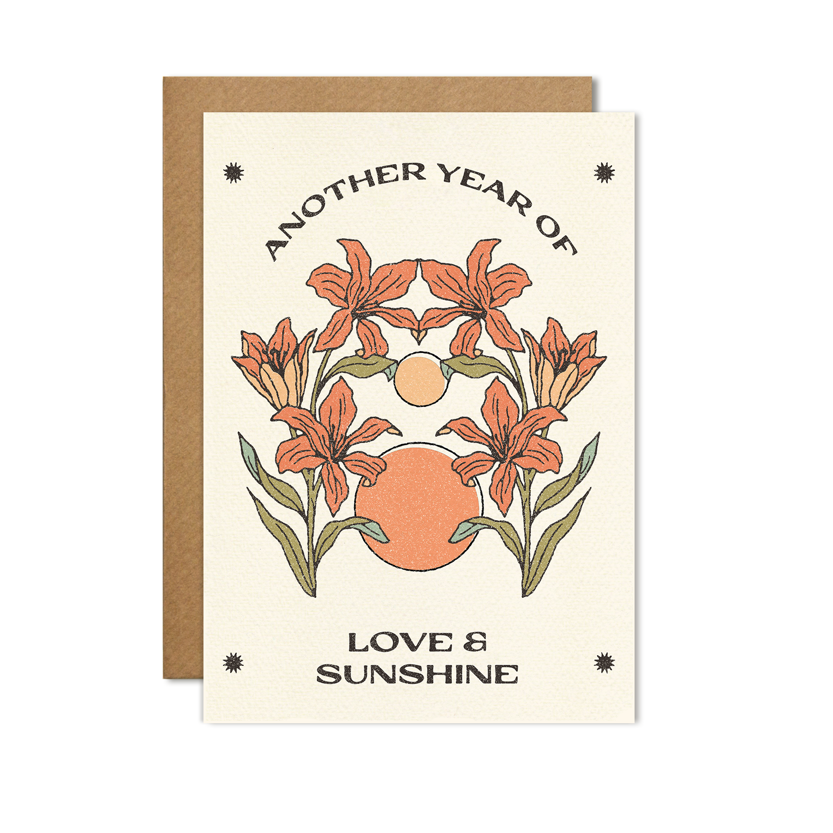 A2 (4.25” x 5.5”) card. Blank inside. Printed on natural white cardstock and individually packaged with a matching envelope in a clear plastic sleeve.