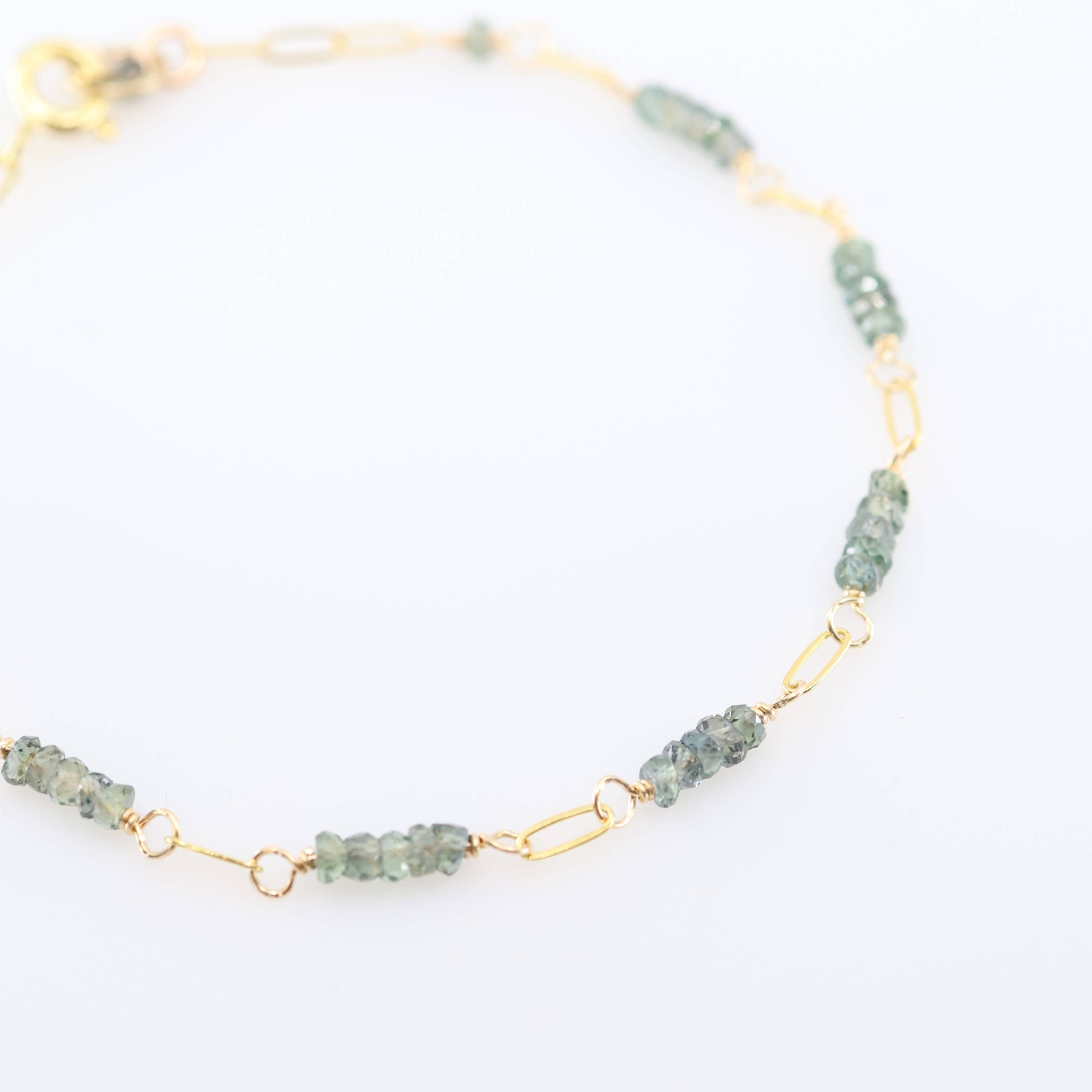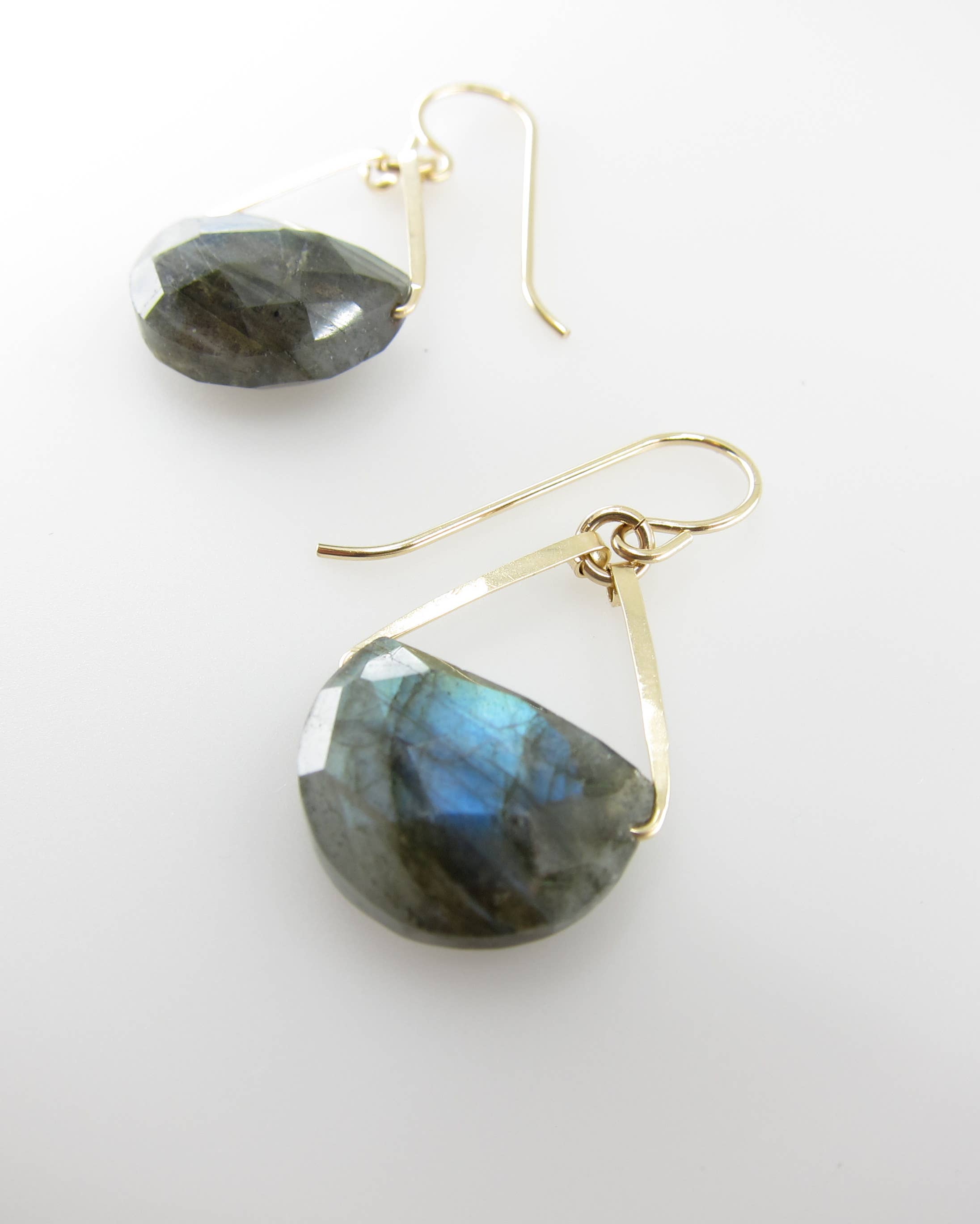 We LOVE the modern design of this forged triangle bail pendant; holding a half moon cut faceted gemstone. A unique take on our single gemstone necklace, featuring your choice of Pyrite, Labradorite, Chocolate Moonstone, Black Onyx, Dendrite Opal, Aqua Chalcedony, Milky Aquamarine, or Lapis Lazuli. Available in 14K GF or Sterling Silver. 16-18" adjustable length.