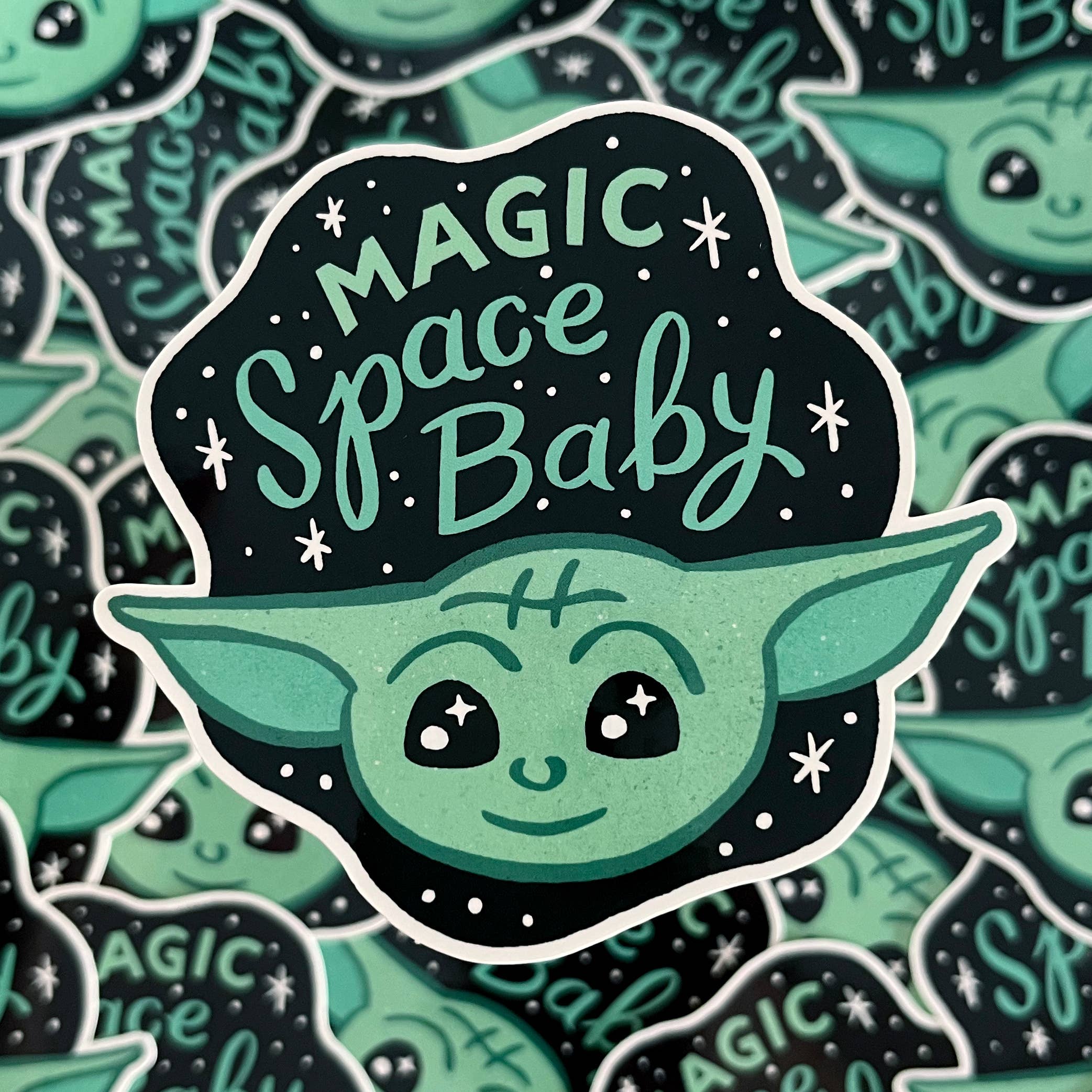 You've found a magic space baby to join you on your adventures! Galactic pizzazz for your lapel or your bag. 1.5 x 5/8 inch (37x14 mm). "hard enamel" pin illustrated by me, Andrew. Black metal with green enamel and green screen printing. Black rubber clasp.