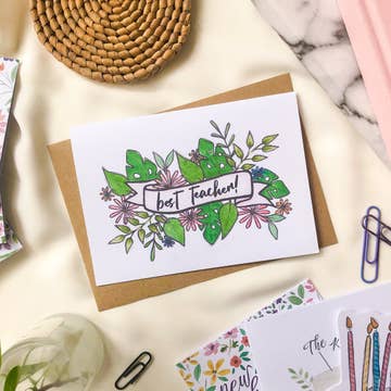 To thank all of the great teachers out there. Graphite penguin wearing a painted backpack and carrying a red apple text reads "Coolest Teacher Ever" Details: Size A2 (4 ¼" x 5 ½") Printed on soft white paper and paired with a Kraft envelope. Blank interior for personal message