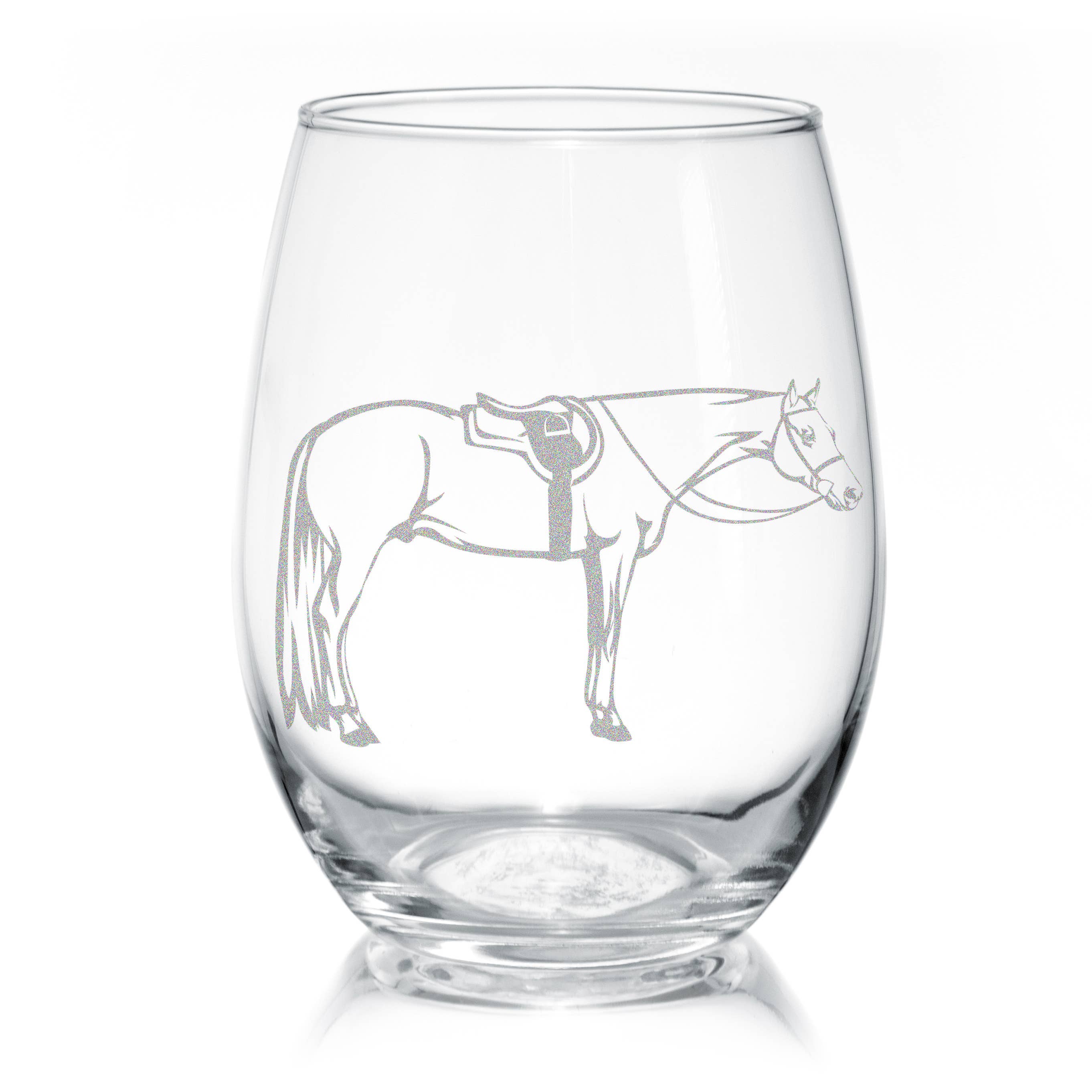 Here's a lovely hunter jumper horse engraved stemless wine glass. Use these 15 oz wine glasses to stand out at a dinner party or a relaxing evening with a friend. The classy sport horse design is laser engraved onto the wine glass in southern Oregon.