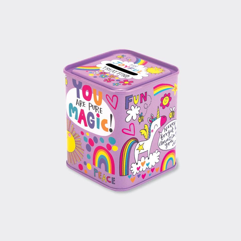 This colourful money tin has a slit in the top to put coins through and a removable base. Size: 92mm x 77mm x 77mm