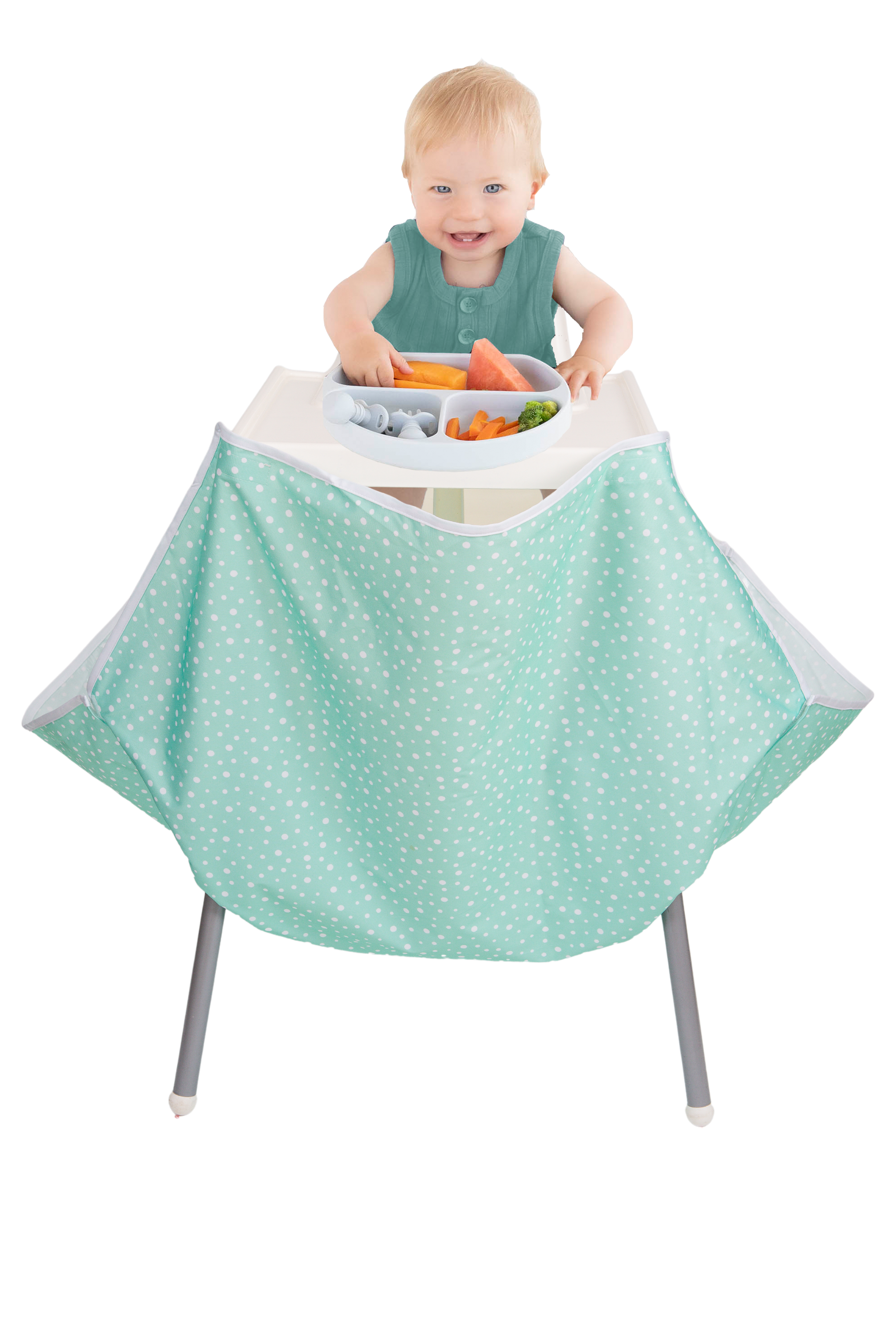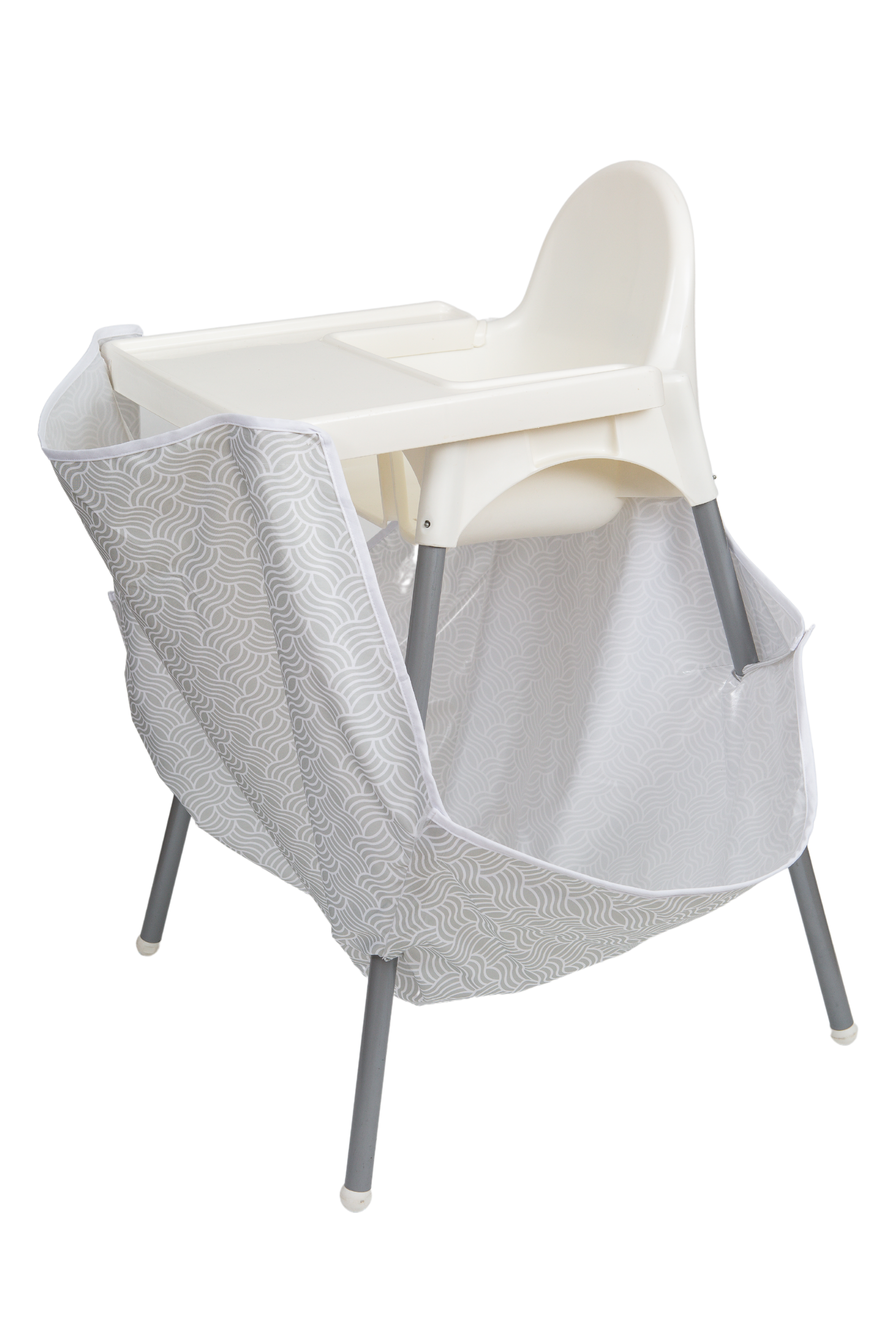 KEEPS FOOD OFF THE FLOOR - Wide net catches falling food and saves your floors and carpets. EASY TO CLEAN - Food and mess is collected in the catcher, simply scoop out and wipe down. EASY TO INSTALL - Uses adhesive Velcro fasteners to attach to front and back. The front can be attached to the high chair tray or underside of table. FITS MOST 4-LEGGED CHAIR - And fits selected 2-legged high chairs. Versatility allows the product to grow with the baby from high chair to booster seat to toddler chair and beyond. Does it fit my high chair? MACHINE WASHABLE - Throw it in with a normal load of washing when needed. PORTABLE - Folds compactly into included carry case to take with you. SAVES STRESS LEVELS - Ideal for baby-led weaning and making feeding time and clean-up a breeze. HOW MUCH HAS BABY EATEN - By seeing how much food has been collected in the catcher and not eaten. *** HIGH CHAIR NOT INCLUDED ***