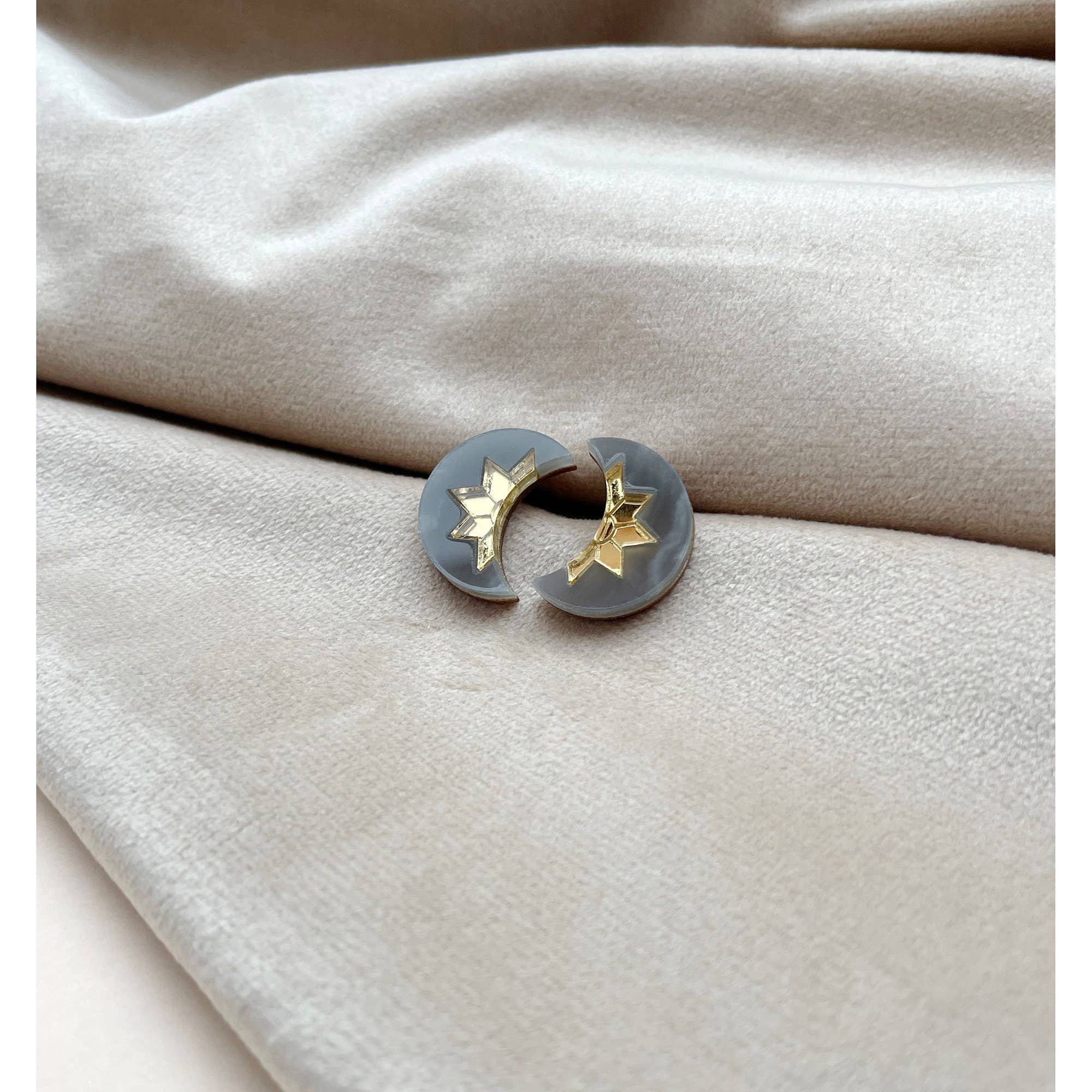 - Koi Fish Stud Earrings in Gold Mirror & Pearl Marble - A bestselling style, these statement stud earrings are inspired by elegant Koi Fish and are available in gold and pearl marble or silver and blue marble. The design is laser-etched and cut from mirror and marbled acrylic. The etched pattern is then hand-inked to highlight the delicate detailing. The earring studs are made from surgical steel, ideal for sensitive ears, and are presented on a custom made arch-shaped earring card. The studs measure 1.5cm x 2.5cm, with the stud post placed at the top of the earring.