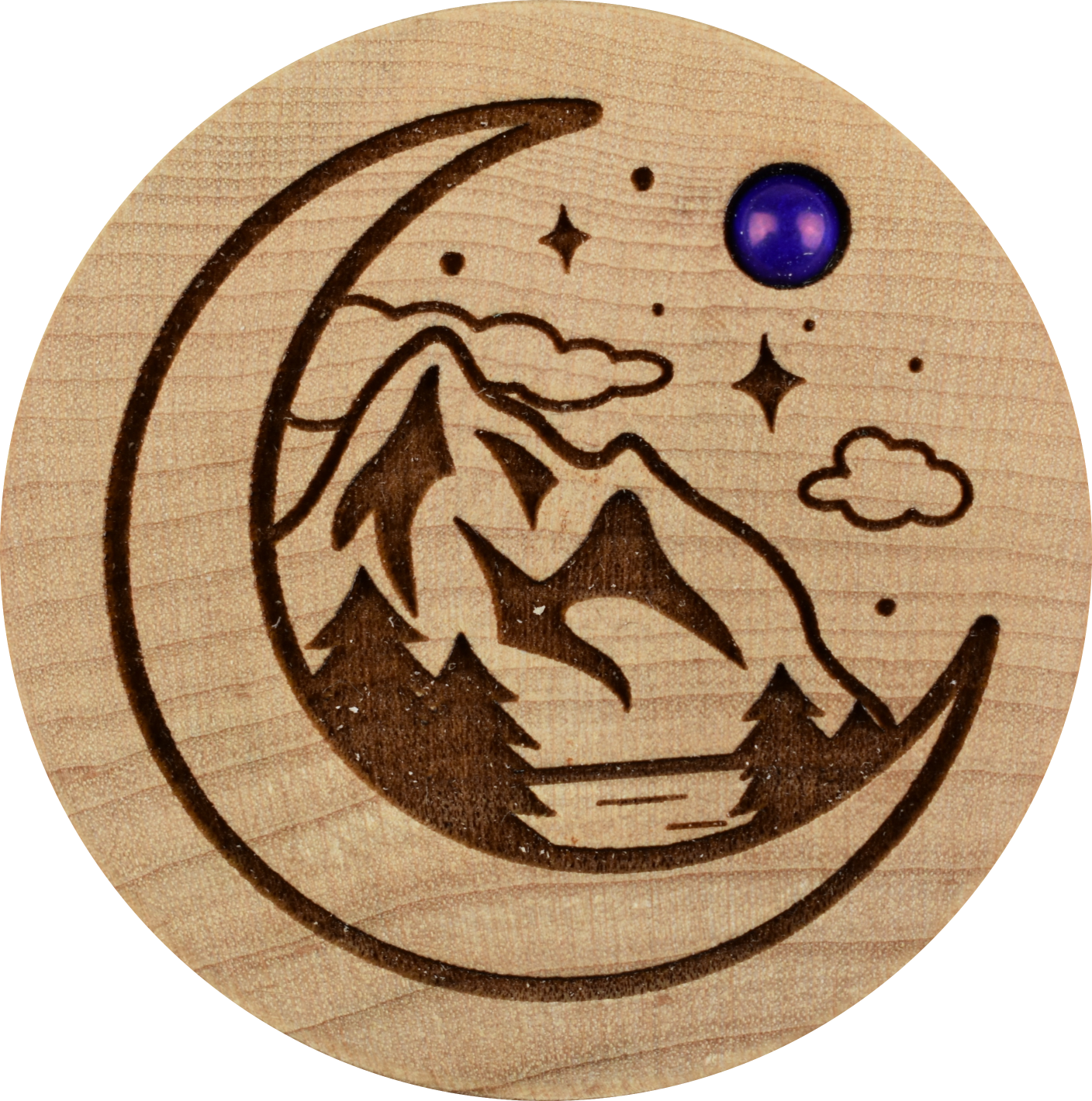 Crescent moon on small maple box w/ rose quartz.