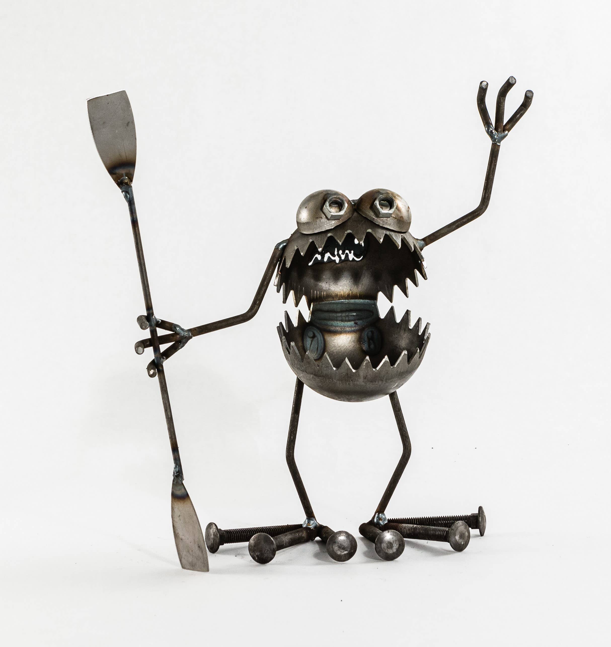 Medium GBG monster handmade from steel components. Approx. 12" tall. GBG riding Mountain Bike feature.