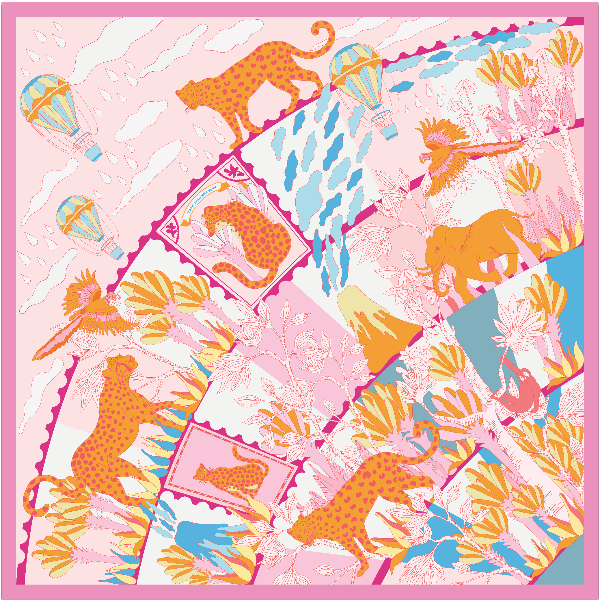 35"x35". This is a world made with different simple shapes and colors. Inspired by the puzzle. All different simple shapes reconstruct a beautiful world. Original hand painted. 100% Silk.