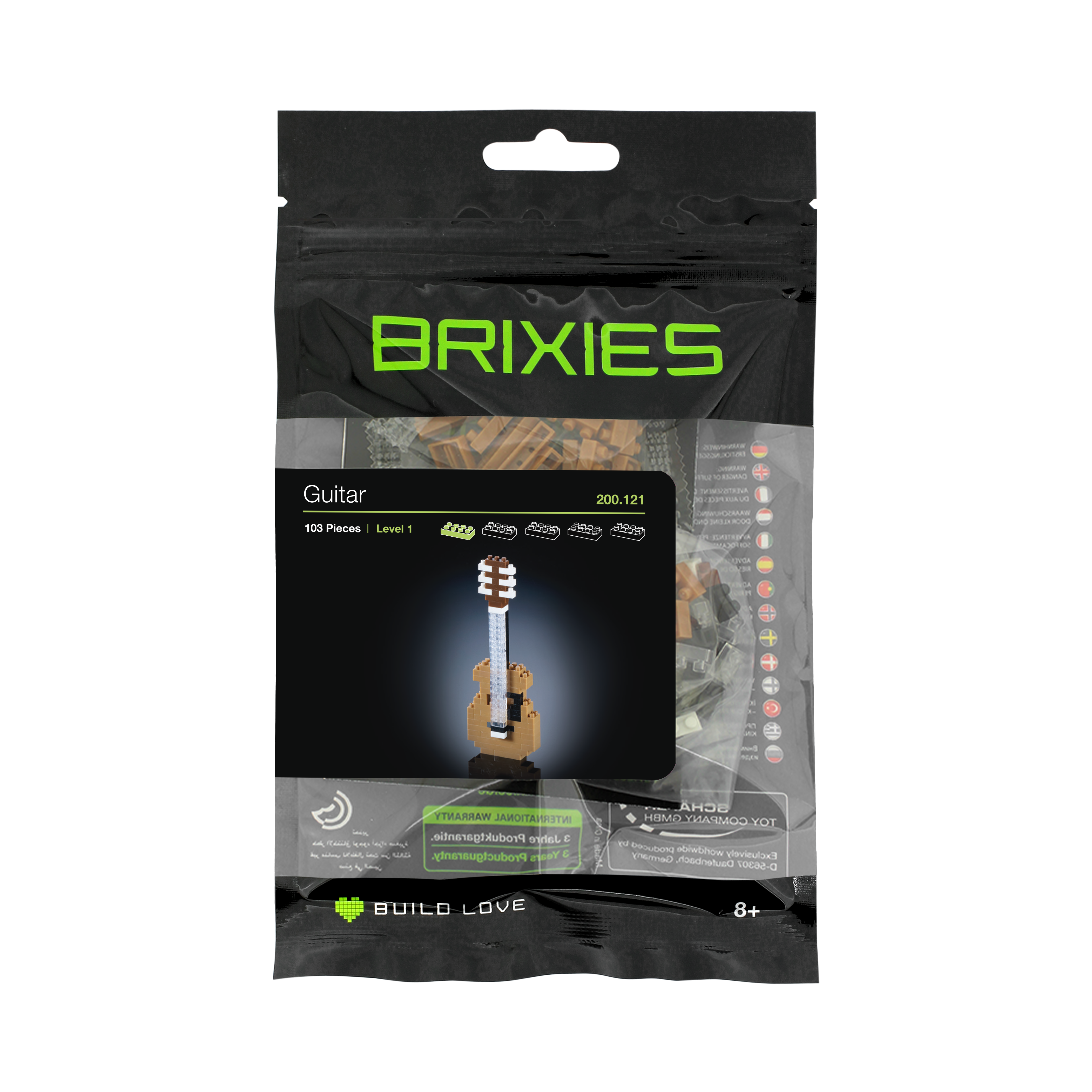 Product information If you love music or play an instrument yourself, you'll love our “BRIXIES Red Electric Guitar” musical instrument kit. Play your own concerts or start a band and go on tour with your friends. There are no limits to your imagination. Our “BRIXIES Red Electric Guitar” kit guarantees little as well as big tinkerers a lot of fun setting it up. The model consists of a total of 115 stones and is 4 cm long, 1.2 cm wide and 12.4 cm high when assembled. BRIXIES building block sets are suitable for ages 8 and over. The building blocks are made of high-quality ABS plastic and meet the latest safety standards.