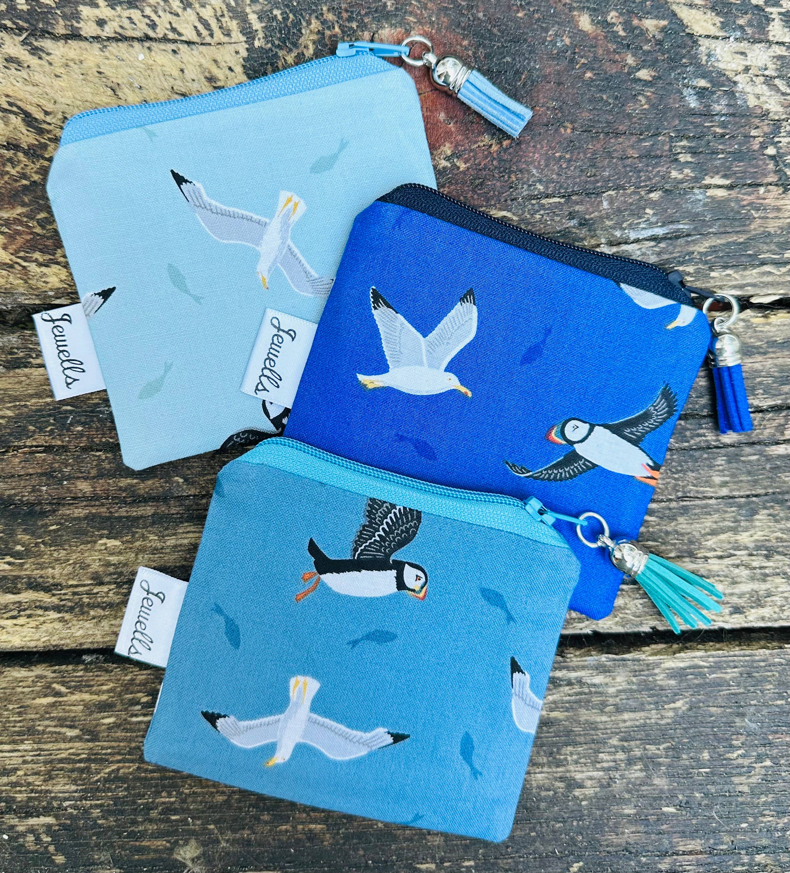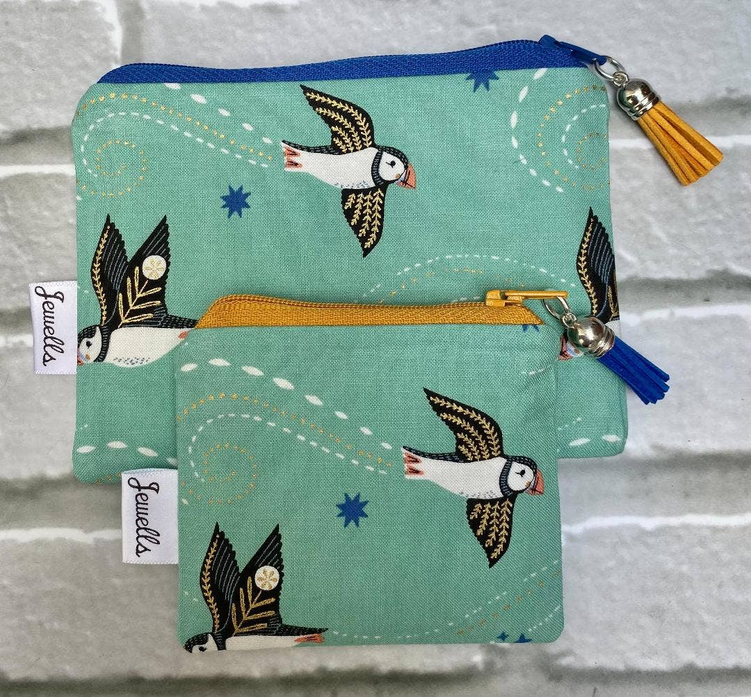 Puffin fabric coin purse Measure approximately 15cm across Available in blue or pink Coordinating plain lining, zip and zip pull Handmade by Jewells