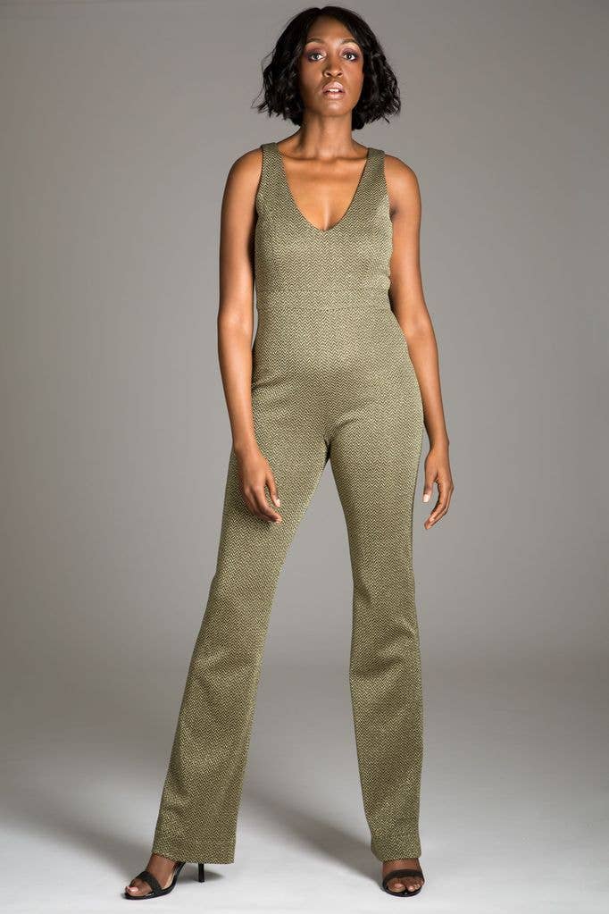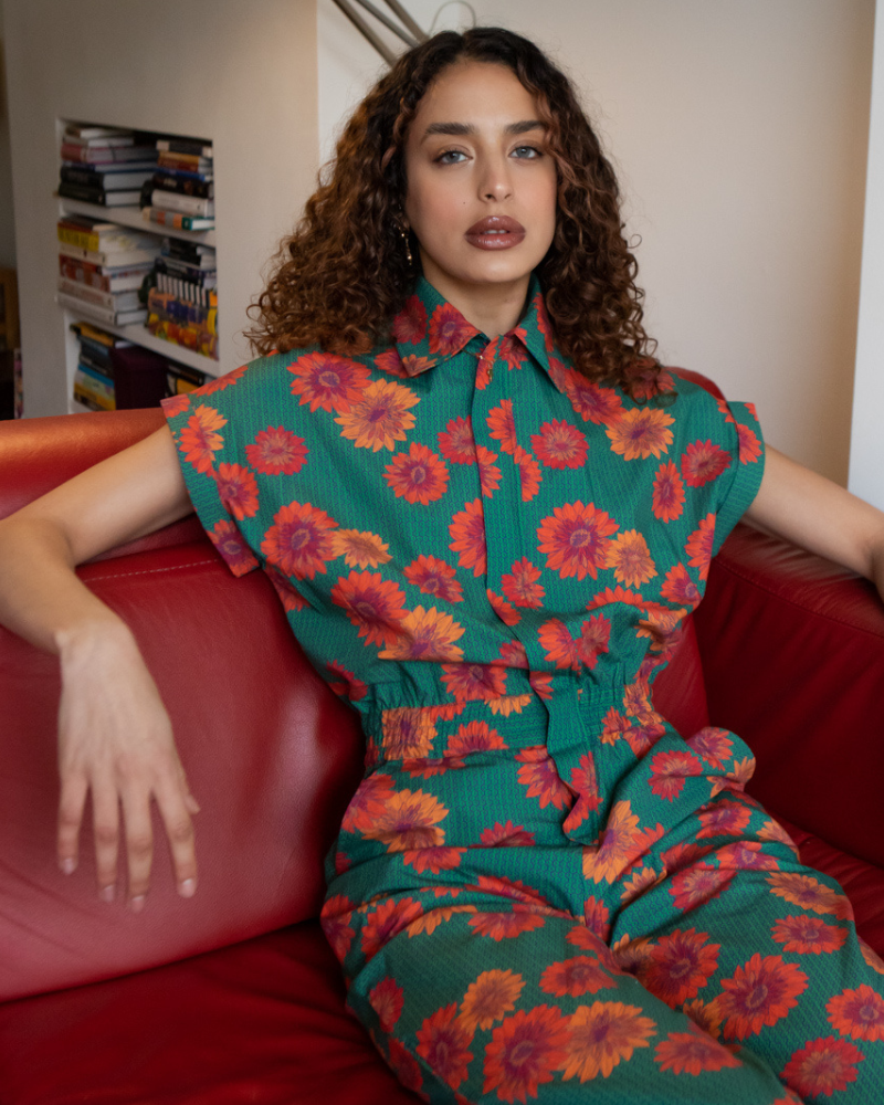 This stylish jumpsuit features a V-neck and short sleeves. Its waist is cinched with a matching belt, while the wide legs offer a fluid silhouette. Ideal for a casual look, it sports a bold and modern print. Victoria & Isaac