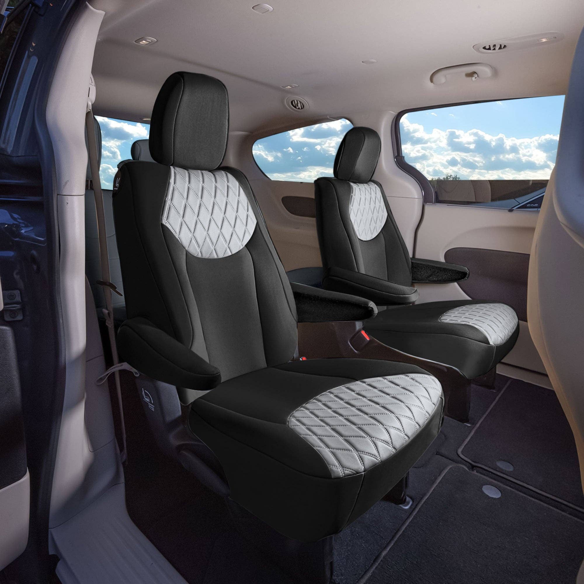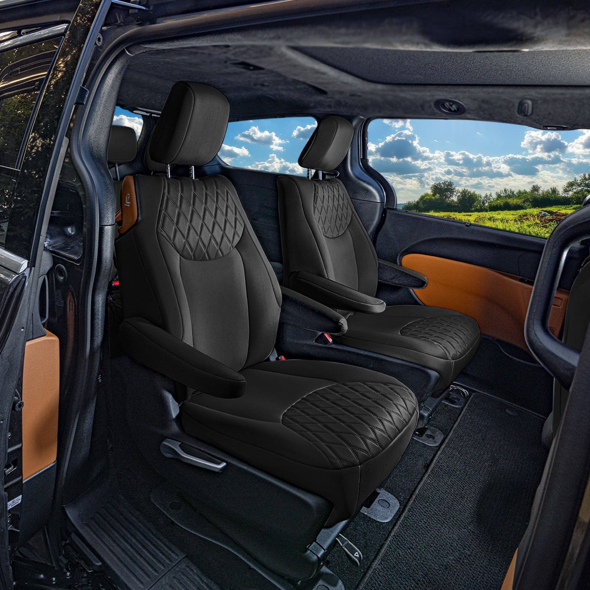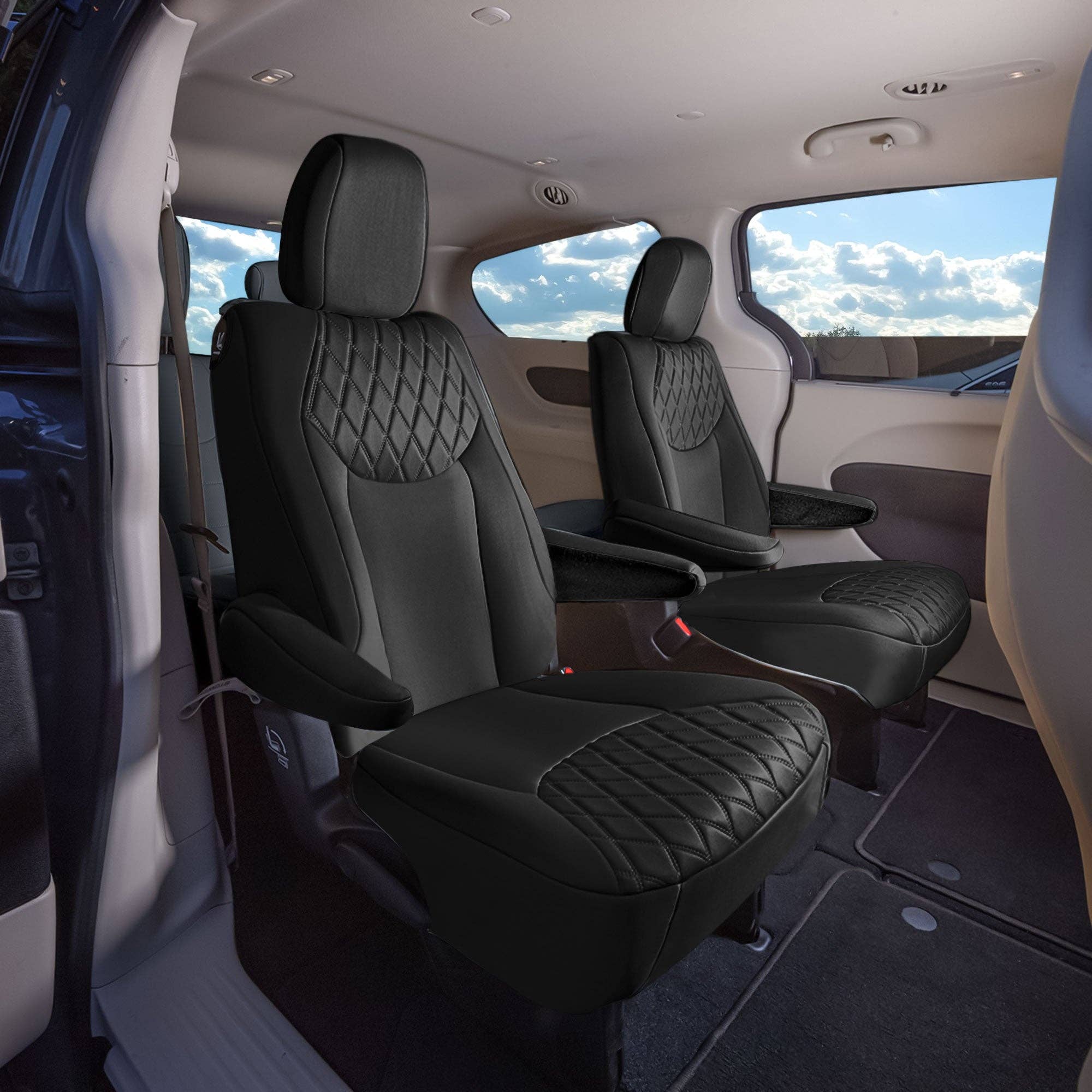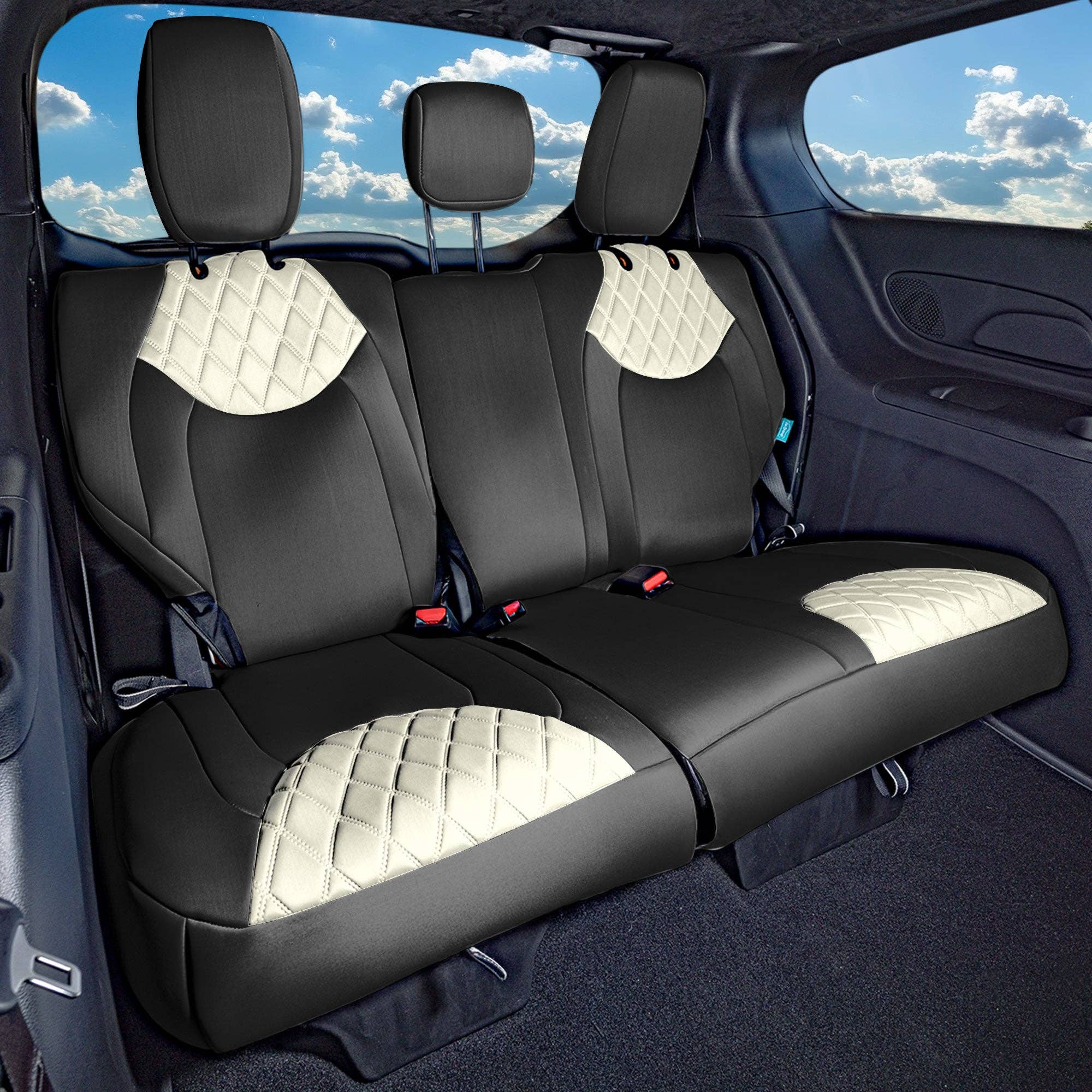 * 3mm of foam padding disperses heat, eliminating the struggle of red hot leather and keeping you cool on even the hottest summer days * PU Leather is soft to the touch, breathable and comfortable * Airbag compatible - special stitching on the side allows airbag deployment. Officially tested! * Concealed hook and loop opening and adjustable straps make installation, removal, and reattachment a breeze * Back of bucket covers made of durable stretchy fabric, as well as pocket for easy storage * Engineered to accommodate traditional and heated seats * Rear seat cover designed to accommodate 50/50, 40/60, 60/40, and 40/20/40 split benches * Fold your rear backrest down, seat up, or move back or forward * Semi-customized to fit most vehicles * Engineered to accommodate traditional and heated seats * Compatible with removable headrests and armrests only Material: PU leather with 3mm foam padding Cleaning tip: Wipe clean Warning:This product can expose you Di-2-ethylhexyl Phthalates and lead which is known to the state of California to cause cancer and birth defects or other reproductive harm.
